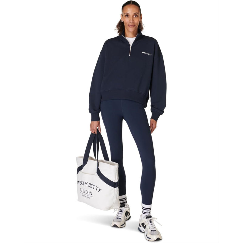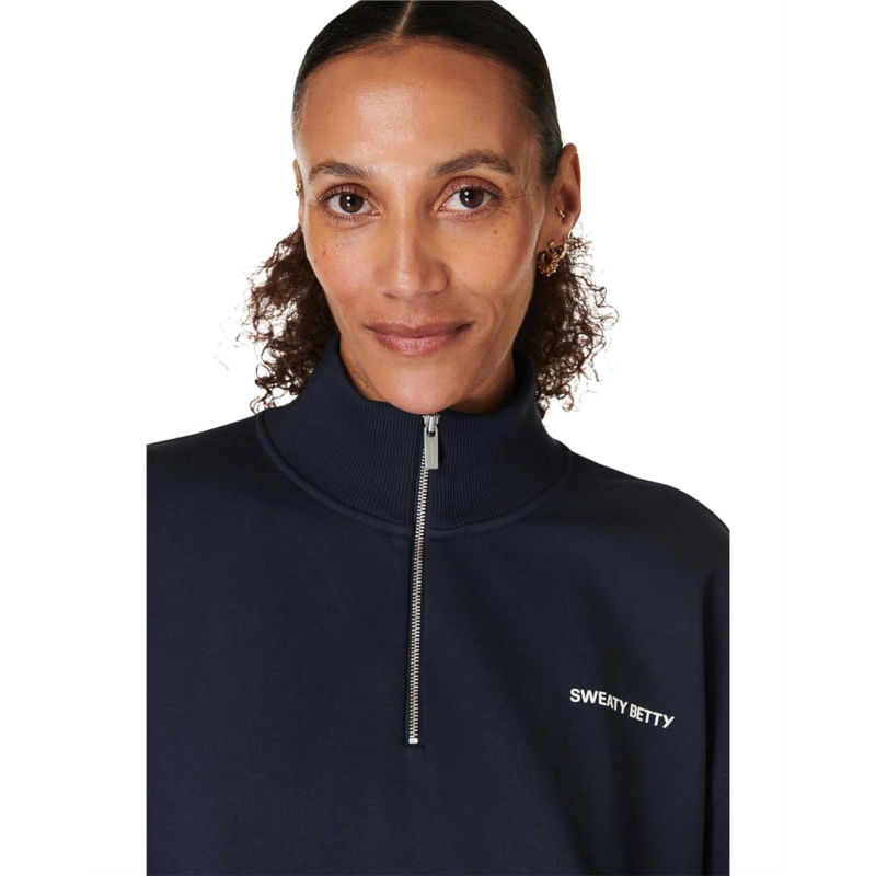 Head out for a casual run or train comfortably wearing the Sweaty Betty Revive Crop 1/2 Zip Pullover. A fresh take on our elevated half-zip sweatshirt, the pullover for women is made from a soft and breathable cotton blend. It features a mock neck, half-zip closure, dropped shoulder design that falls to the top hip, long sleeves, and ribbed details at the cuffs, neck, and waistline. The brand logo detail at the left chest adds an authentic touch.