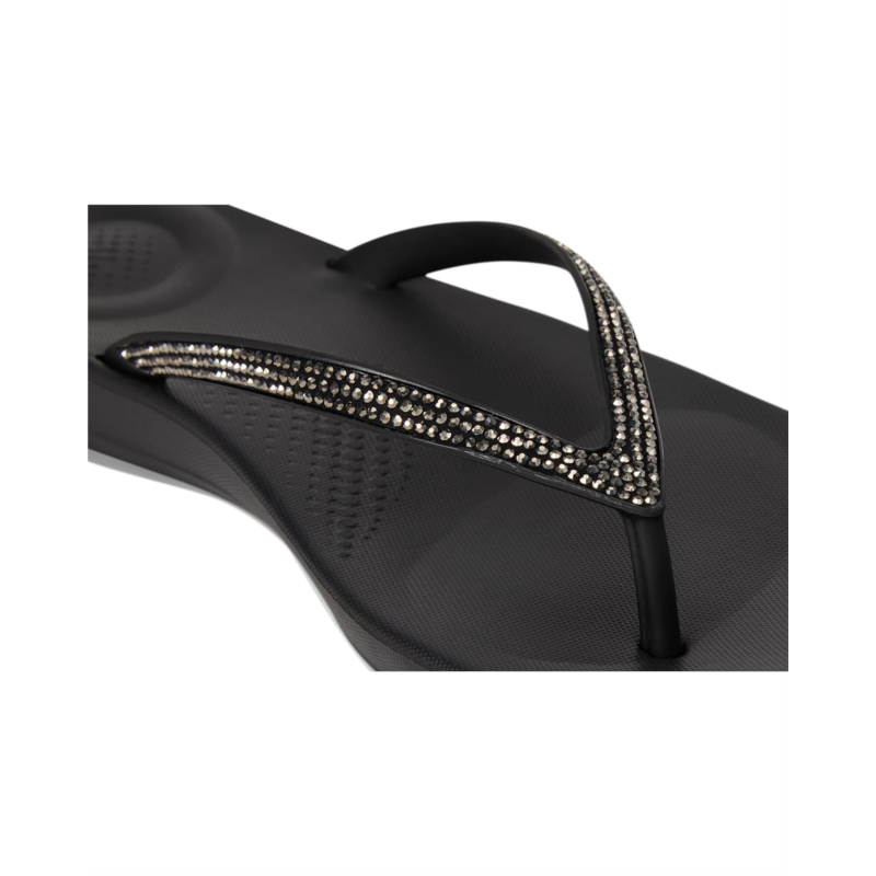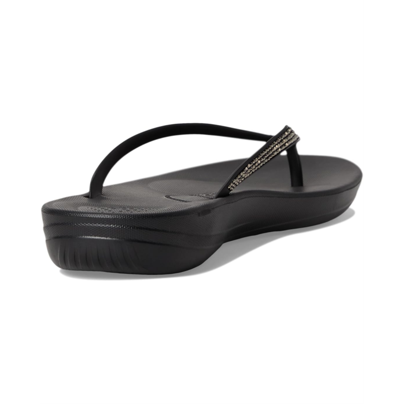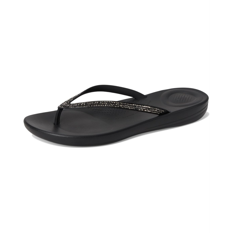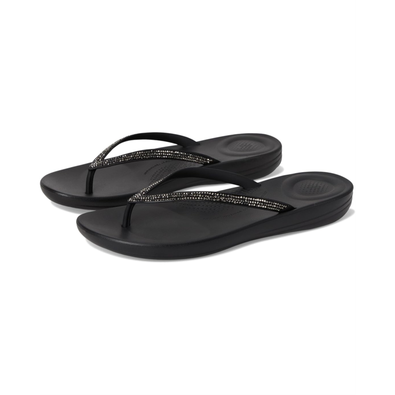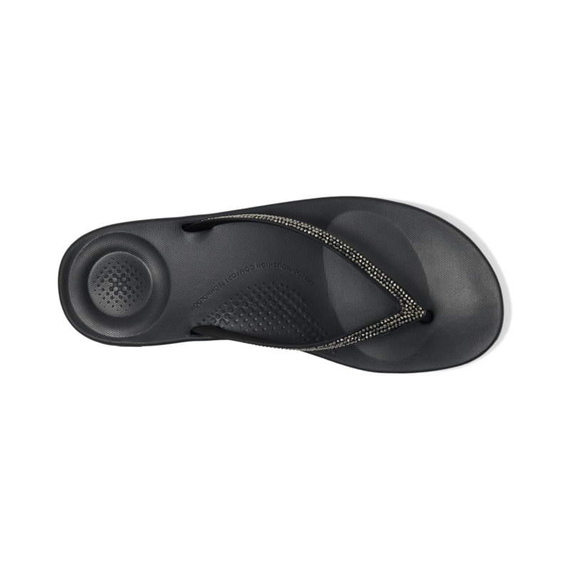 - FitFlops comfort-engineered, surfer-girl flip-flops smothered with micro-crystals. From the top, they look like your typical surfer-girl flip-flops. Underneath, theyre engineered with FitFlops featherlight, pressure-diffusing iQushion midsole tech. Made of high-rebound air-foam that retains its cushioning, with heel and ball-of-foot impact pillows, and a contoured footbed for natural support when you walk. Anatomically shaped straps hold the sandals to you, to help stop toes gripping. This version adorned with sparkling micro-crystals, throw a pair in your suitcase and youll find yourself wearing them to beach, bar and beyond. Waterproof and slip-resistant.