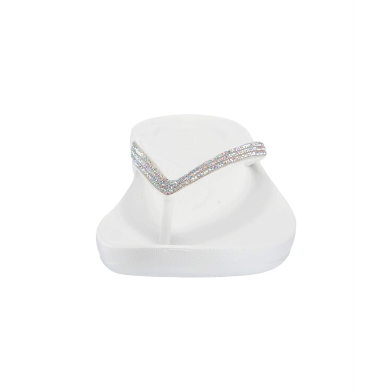 - FitFlops comfort-engineered, surfer-girl flip-flops smothered with micro-crystals. From the top, they look like your typical surfer-girl flip-flops. Underneath, theyre engineered with FitFlops featherlight, pressure-diffusing iQushion midsole tech. Made of high-rebound air-foam that retains its cushioning, with heel and ball-of-foot impact pillows, and a contoured footbed for natural support when you walk. Anatomically shaped straps hold the sandals to you, to help stop toes gripping. This version adorned with sparkling micro-crystals, throw a pair in your suitcase and youll find yourself wearing them to beach, bar and beyond. Waterproof and slip-resistant.