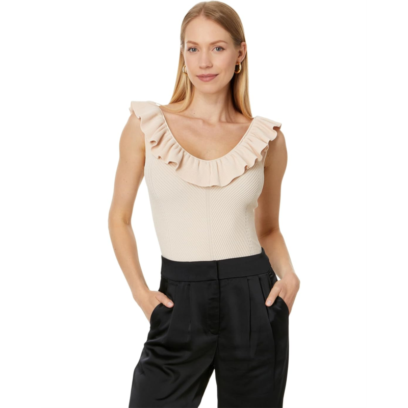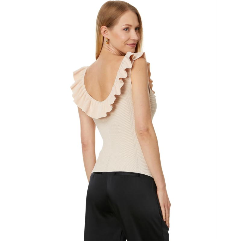 Effortlessly elevate your everyday casual look and experience comfort all-day long wearing Ted Baker Samaha Rib Detail V Neck Knit Top. The rib-knit top features a fitted construction, V-neckline with ruffled detail on the front & back, sleeveless design, and straight hem.
