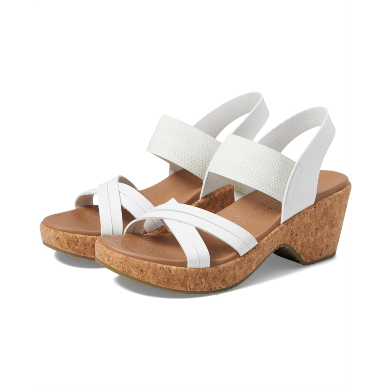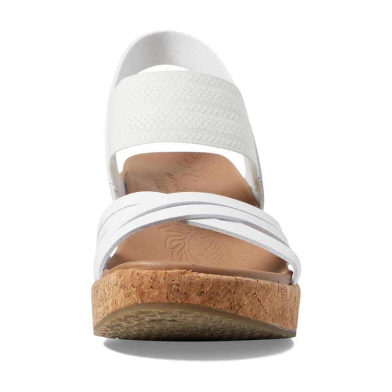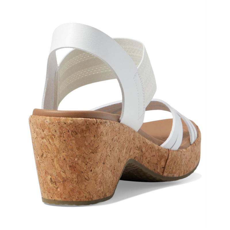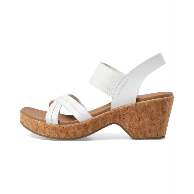 Make a stylish statement wearing the SKECHERS Brystol - Night Skies. Crafted with vegan materials, this strappy wedge sandal features a synthetic upper with a pull-on gore strap, and a cushioned Luxe Foam footbed. It comes with brand detailing on the footbed.