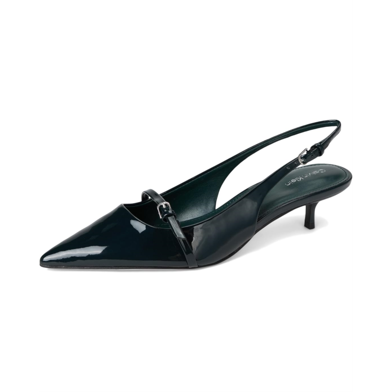 Sleek sophistication meets modern glamor in the Calvin Klein Simira. Designed for women who want polish with comfort, this dress pump blends timeless elegance with everyday wearability. Crafted with a smooth PU upper and a soft manmade lining, it ensures a luxe feel while staying lightweight. The adjustable slingback buckle strap provides a secure, personalized fit, while the pointed toe and chic kitten heel elevate your look with subtle confidence. A cushioned EVA outsole delivers all-day comfort without sacrificing style, making these heels perfect for workdays, nights out, or special occasions.