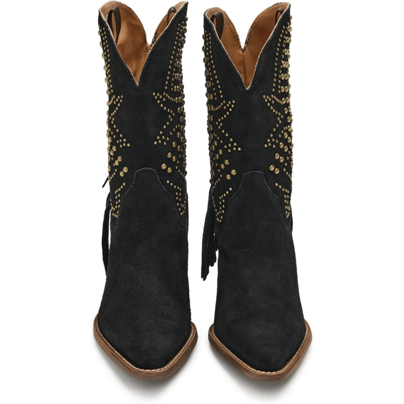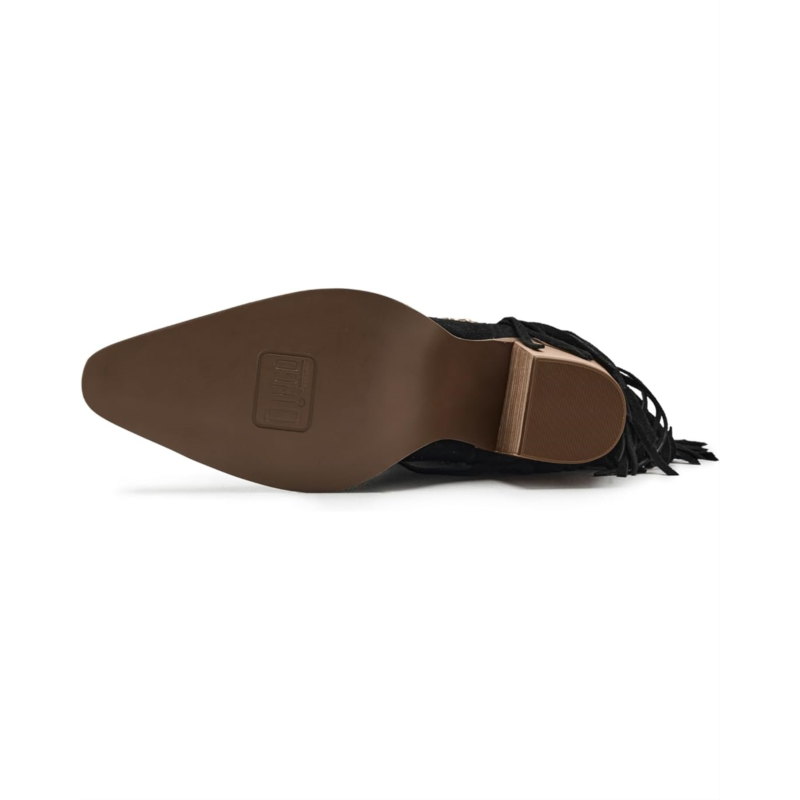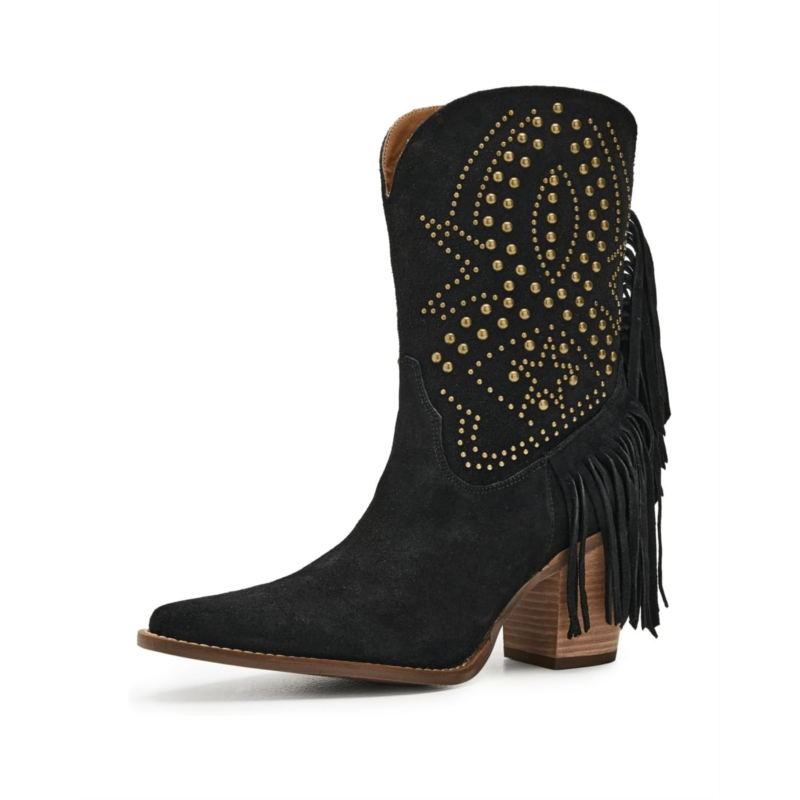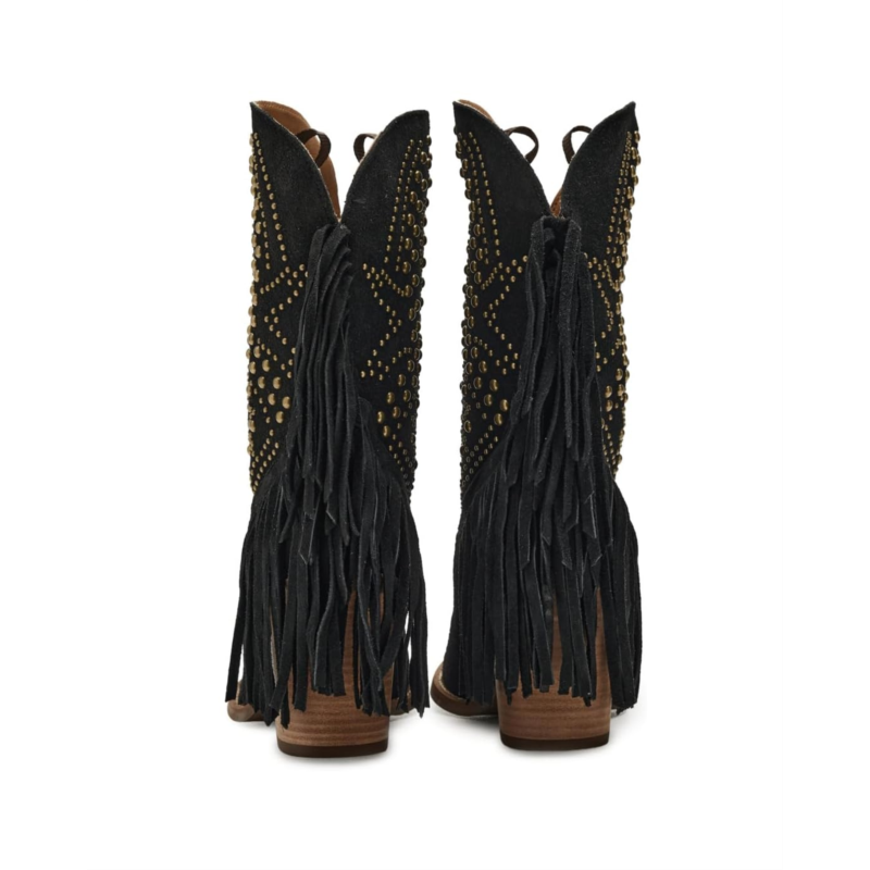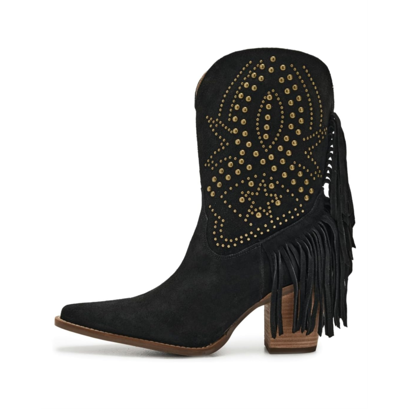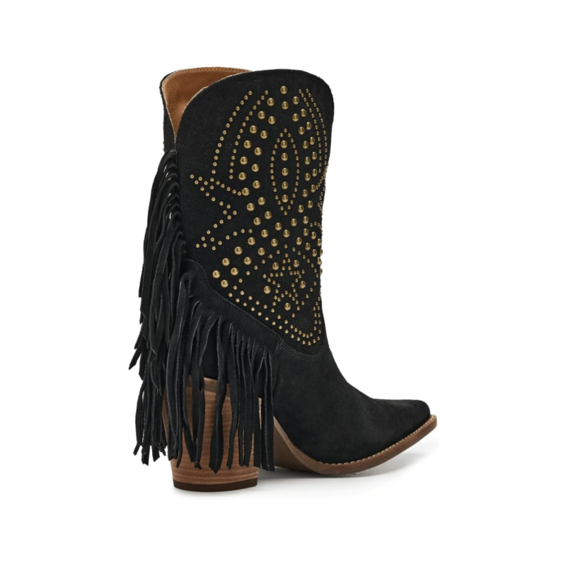 - Own every moment in the Dingo Star Power boot, a dazzling fusion of bold attitude and effortless Western charm. Designed with a luxe suede upper and smooth polyester lining, it delivers comfort that lasts as long as your spotlight. The cushy foam insole and durable rubber outsole keep every step steady, while the iconic snip toe adds a touch of classic cowgirl finesse. Slip into the calf-high, pull-on silhouette and watch the magic unfold as edgy studs, shimmering stars, and playful fringe cascade over the heel, creating movement, sparkle, and pure show-stopping energy.