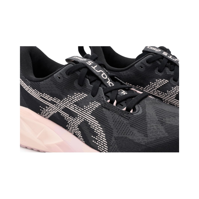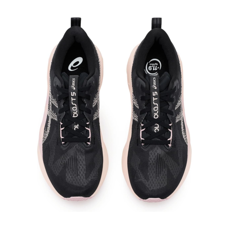 - The ASICS Novablast 5 shoes midsole and outsole geometry help produce an energized ride. Their tongue wing construction in the polyester upper helps improve the fit while reducing tongue movement. These running shoes are made of a rubber insole and polyester lining. At least 75% of the shoes main upper material is made with recycled materials to reduce waste and carbon emissions while the sockliner is produced with the solution dyeing process that reduces water usage by approximately 33% and carbon emissions by approximately 45% compared to the conventional dyeing technology. The FF BLAST MAX cushioning helps create softer landings and more energized toe-off during your training. These lace-up shoes are complemented with an engineered jacquard upper that offers more stretch, ventilation, and durability.