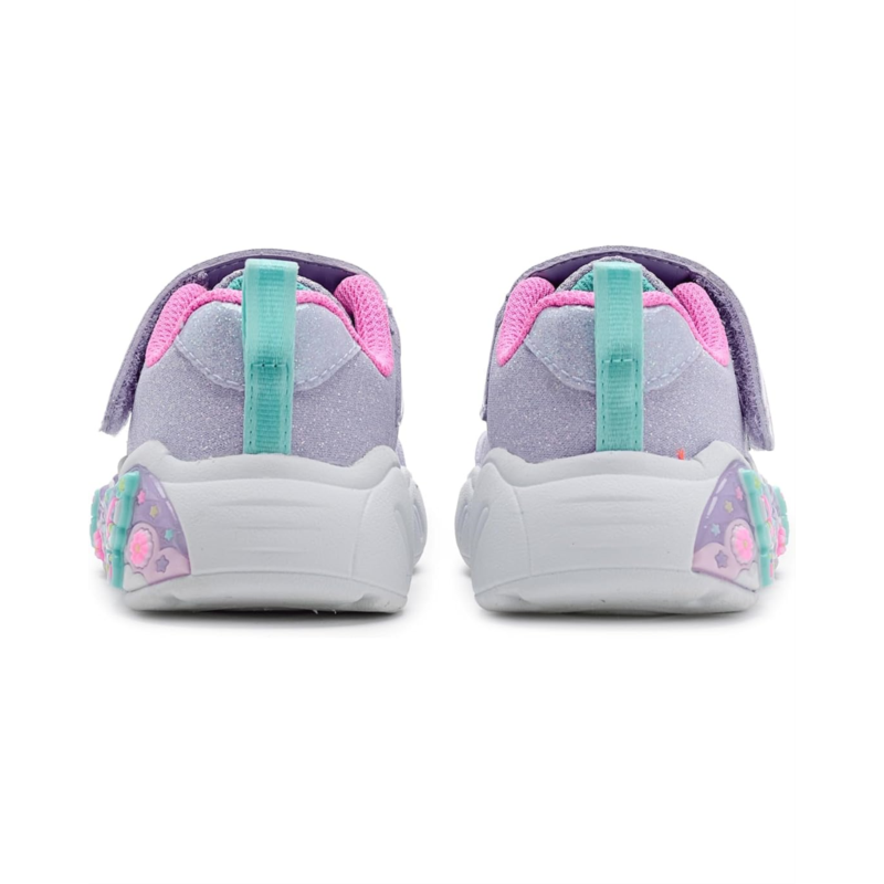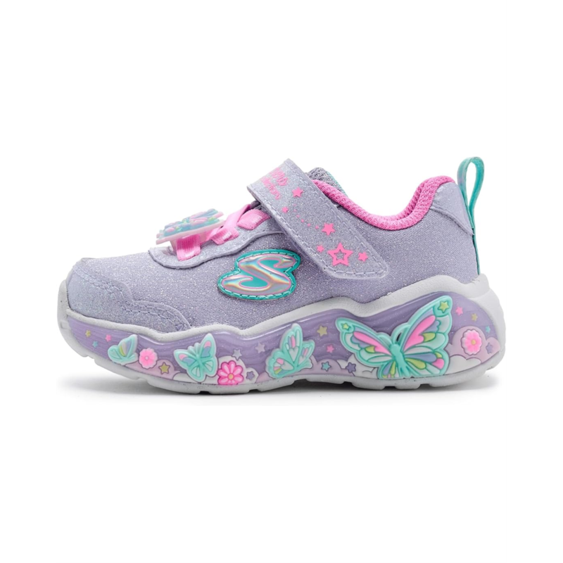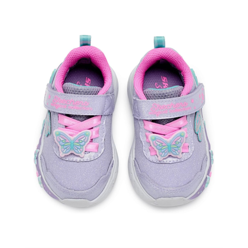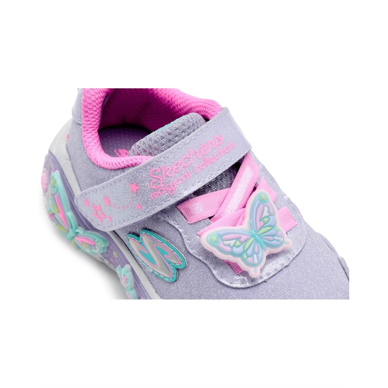 - Sparkle and shine in style wearing SKECHERS KIDS Lil Butterfly Bliss 303066N Sneakers. This sporty Magical Collection butterfly theme design features a butteryfly wrapped synthetic rubber outsole with lighted details, a synthetic and sparkle mesh upper with stretch laces and a cushioned comfort footbed. Skechers easy-on, easy-off adaptive hook-and-loop closure allows for a customized fit, while the ankle pull tab allows easy donning & doffing.