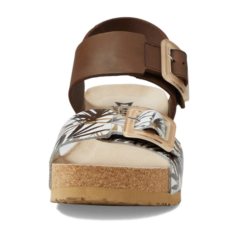 Hook-and-loop closures with decorative buckles on the straps.