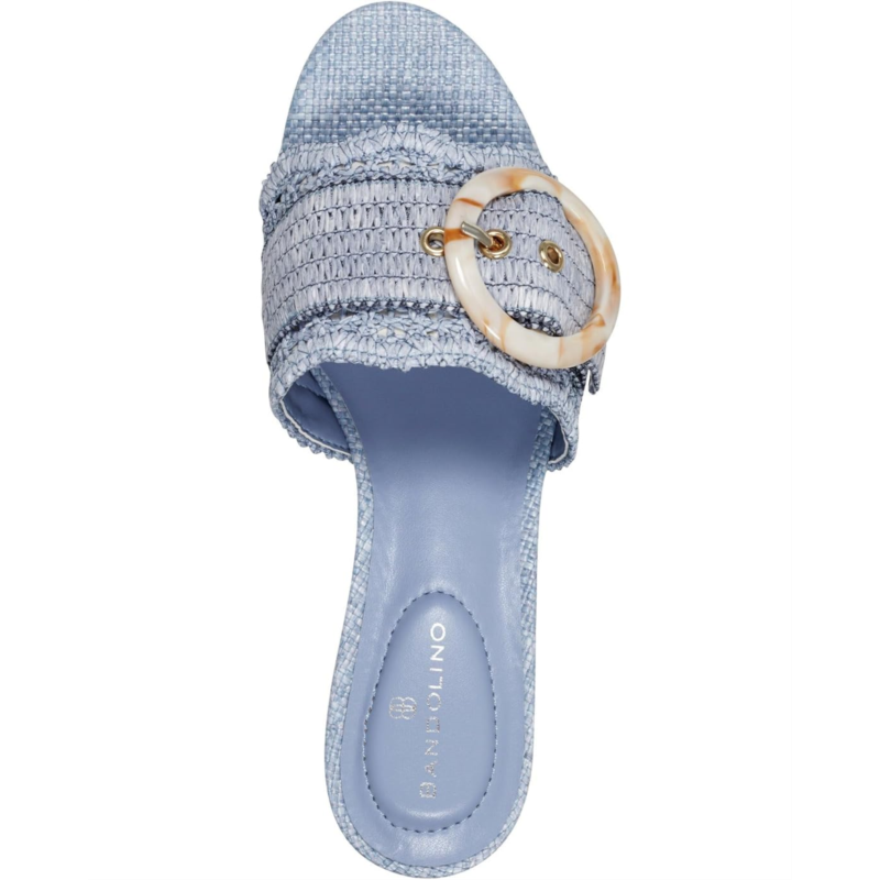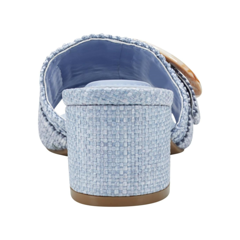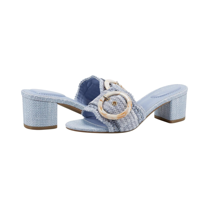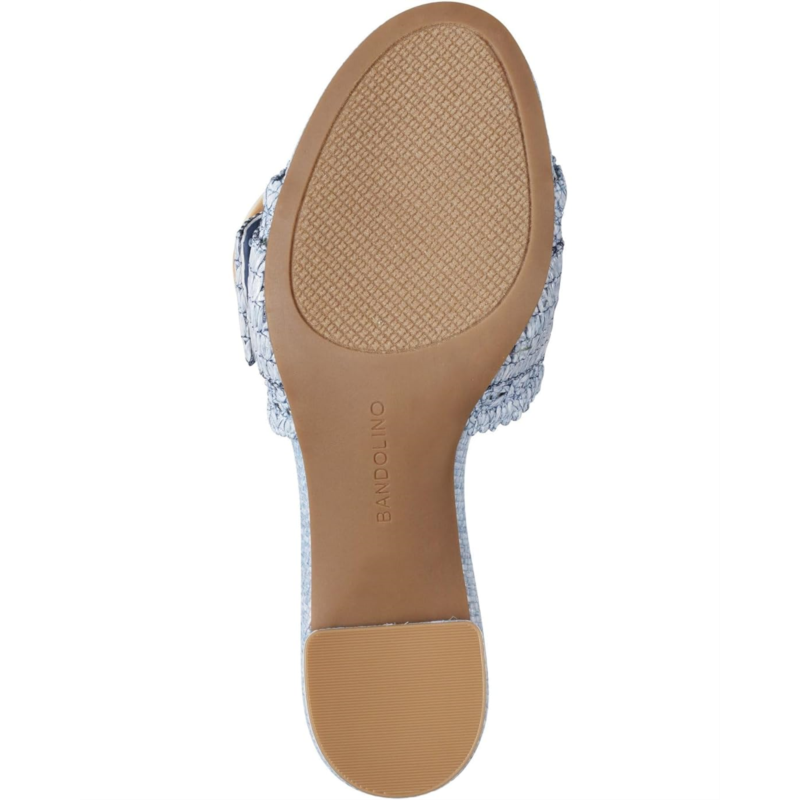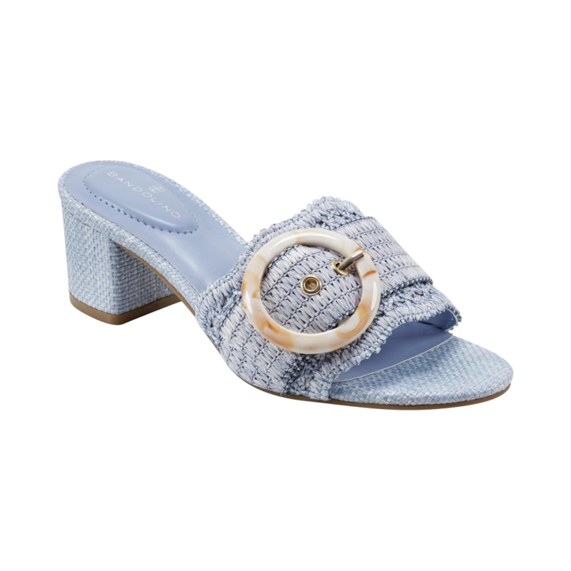 These elegant Bandolino Anni raffia crochet block heel slide sandals add instant style. They feature an on trend oversized buckle and beautiful scallop detail. This open almond toe silhouette slip-on has textile upper, man-made PU lining, foam insole, and synthetic rubber outsole construction.