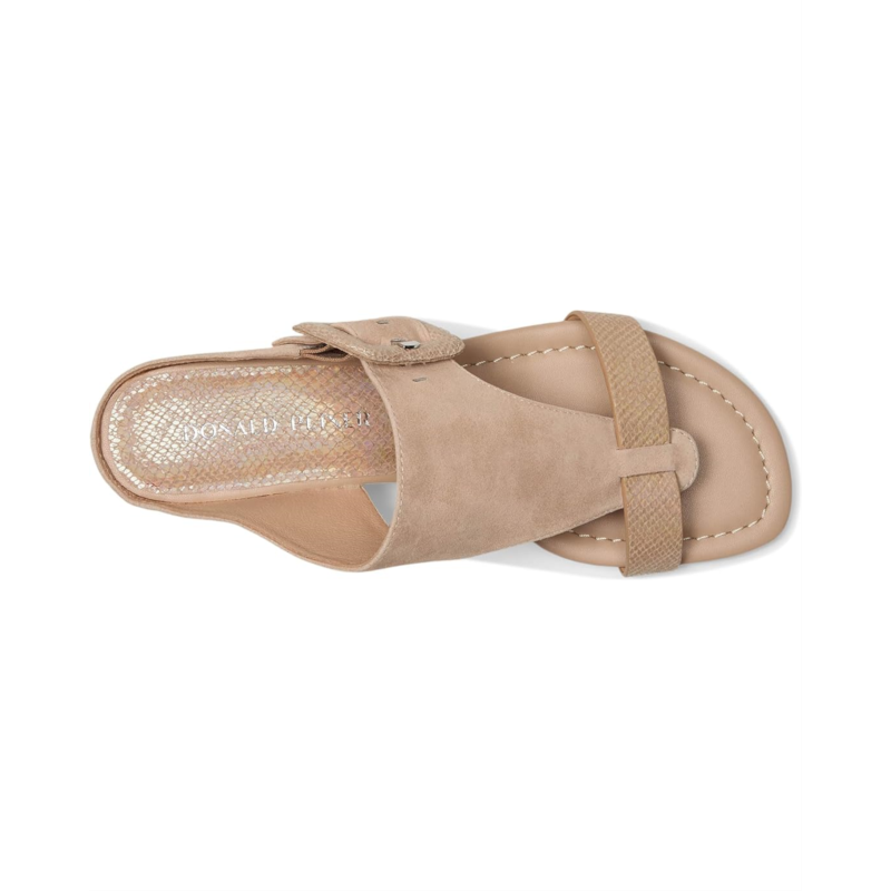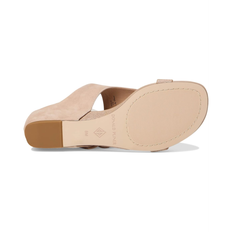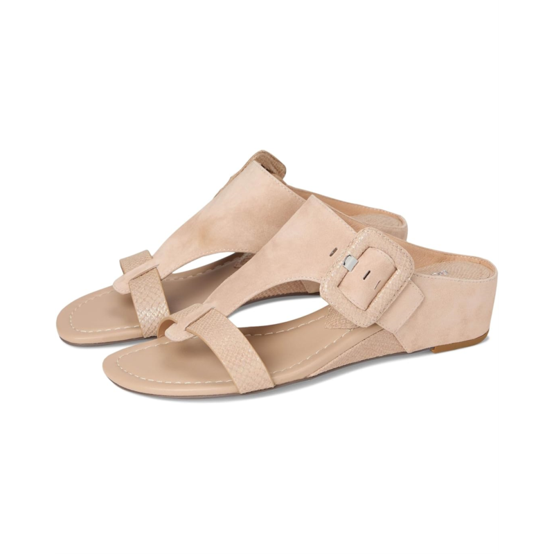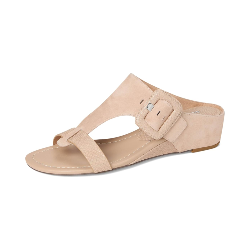 The Donald Pliner Ofelia sandal makes a chic statement with a T-strap silhouette, open toe, oversized buckle detail at the side, and wedge heel.
