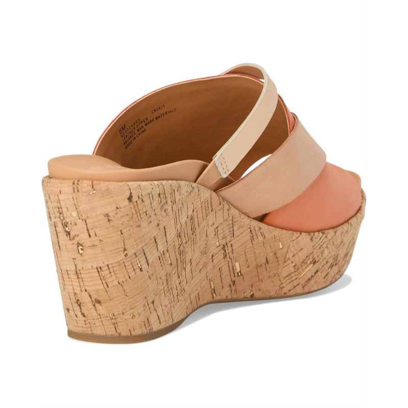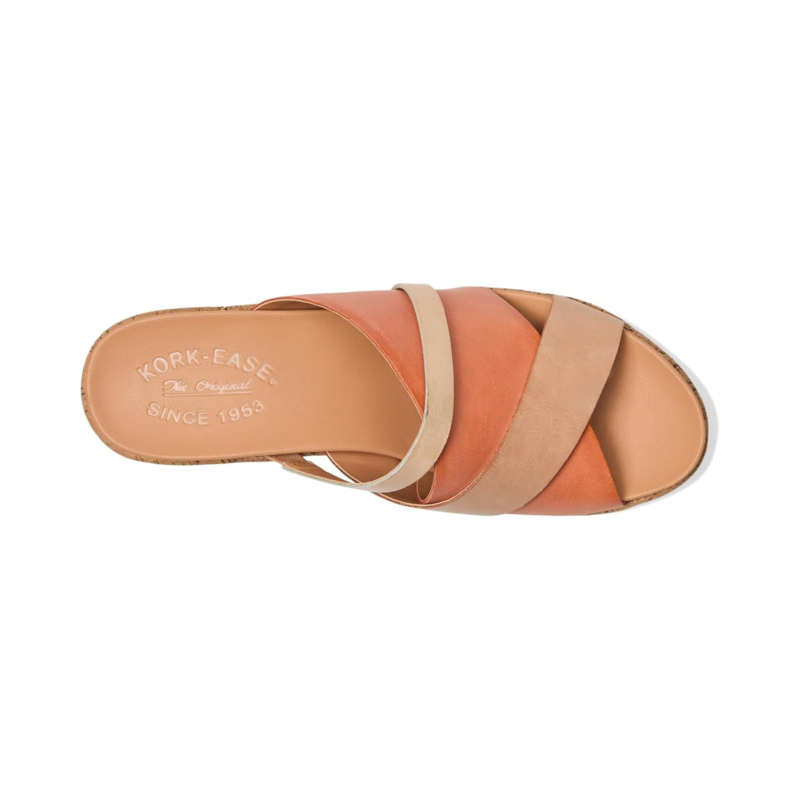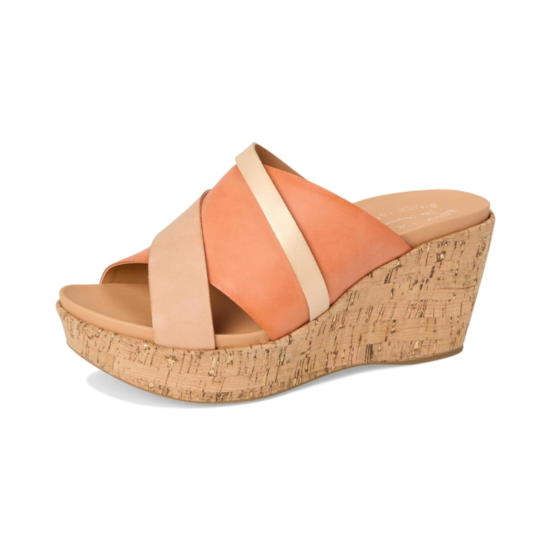 Stroll through summer in eye-catching style wearing the Kork-Ease Addie slides with swirls of color-blocked leather. This slip-on footwear is designed with a self leather wrapped wedge and platform heel.
