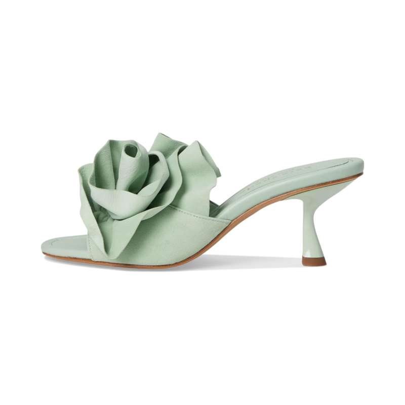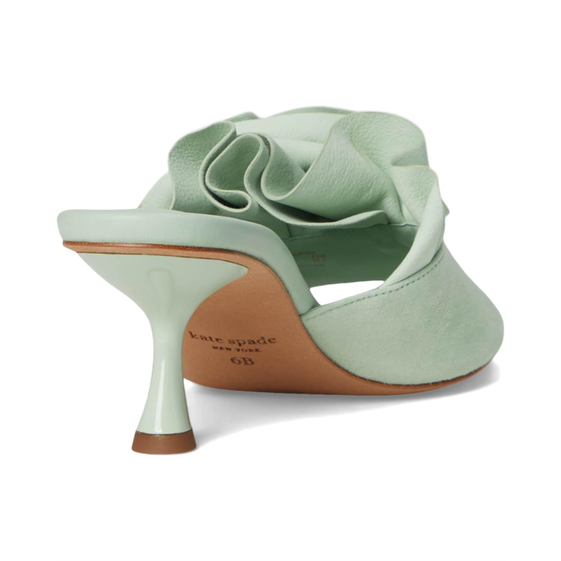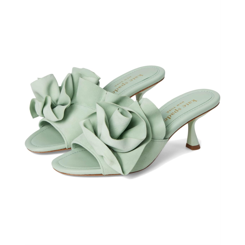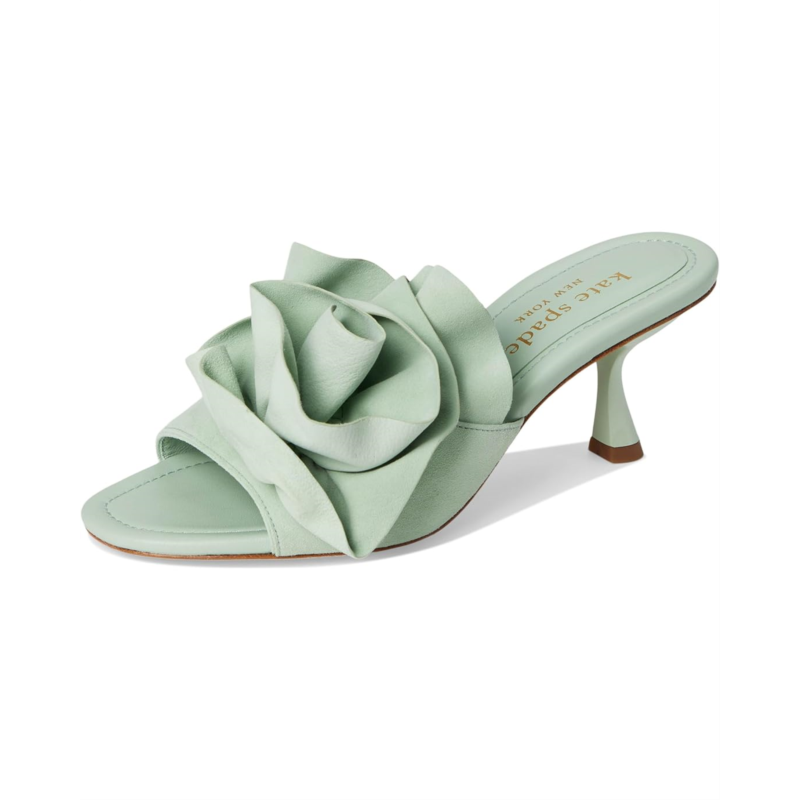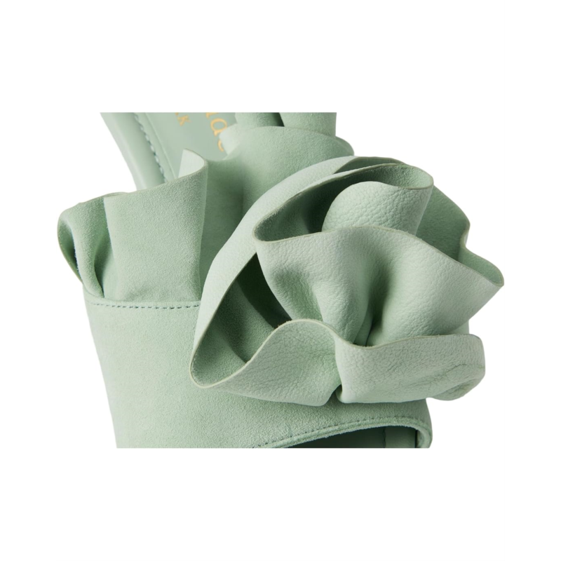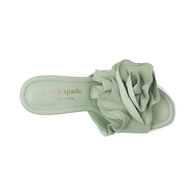 Up your footwear game adding this Kate Spade New York Flourish slip-on to your collection. It has leather upper with a 3D flower strap and slide on style. Lined with leather the slip on features open toe, leather insole and wedge platform.