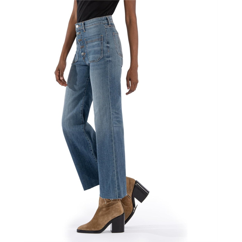 KUT from the Kloth Petite Meg High-Rise Wide Leg Exposed Button Raw Hem Patch Pockets in Prevent
