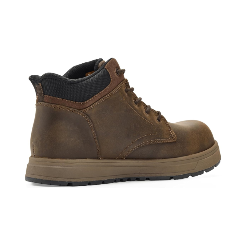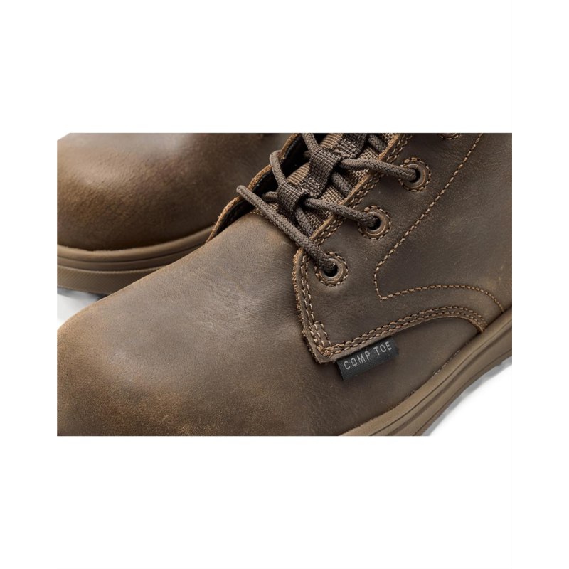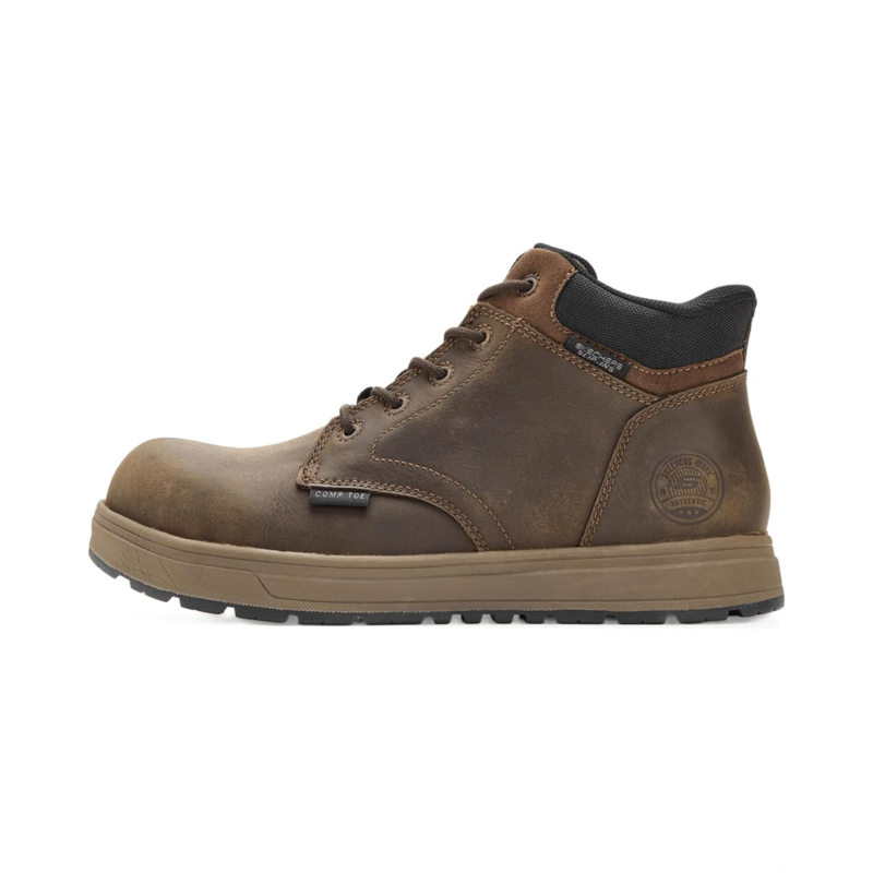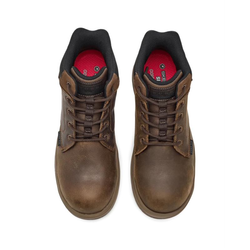 - Bring comfort to your feet by wearing the SKECHERS Work Declon Comp Toe. Crafted with a leather upper, polyester lining, and a foam insole, these ankle-high boots offer the best of both durability and comfort with every step you take. The hands free slip-in technology ensures easy on/off, while the lace-up closure ensures a secure fit.
