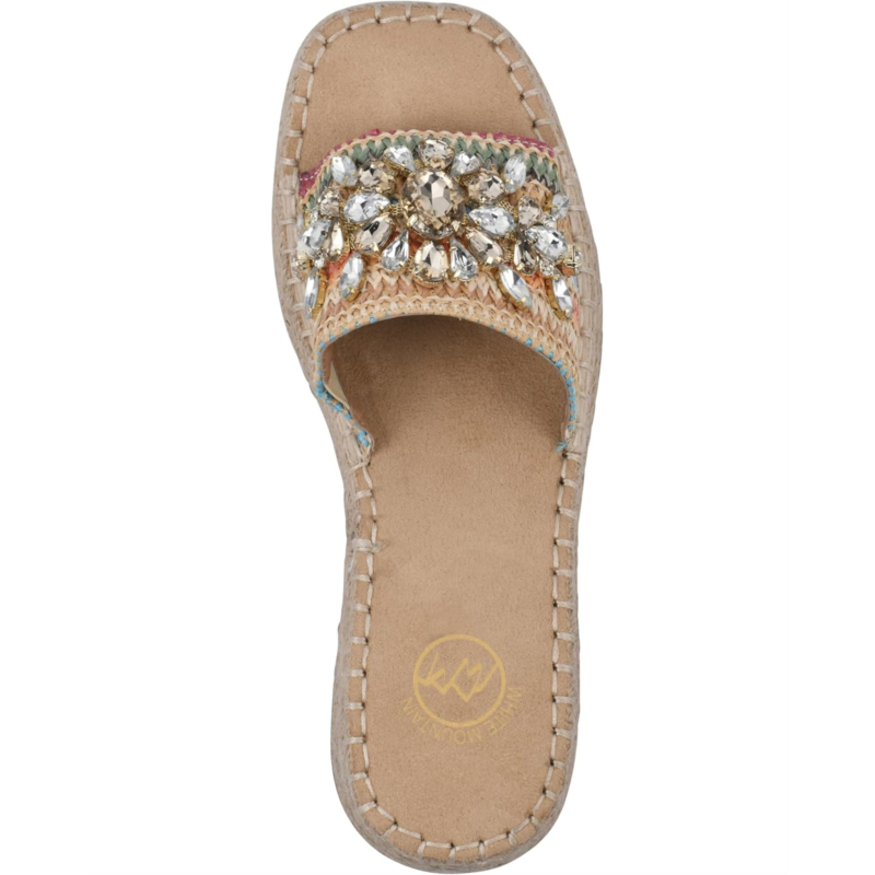 Put a spring in your step wearing the White Mountain Stitch. Crafted from bejeweled design, thick upper band, faux suede lining and lightly cushioned insole, this pair of sandals features open round toe, stitching details, jute-wrapped espadrille platform heel and brand detailing on the footbed.