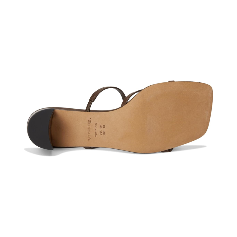 Detailed with slender leather straps, the Vince Ona Strappy sandal is finished with a sculpted block heel for a clean fusion of ''90s minimalism and modern edge. Crafted from leather upper and lining responsibly sourced from Leather Working Group certified tanneries material. Featuring open square toe, slip-on style, and brand detailing on the footbed.