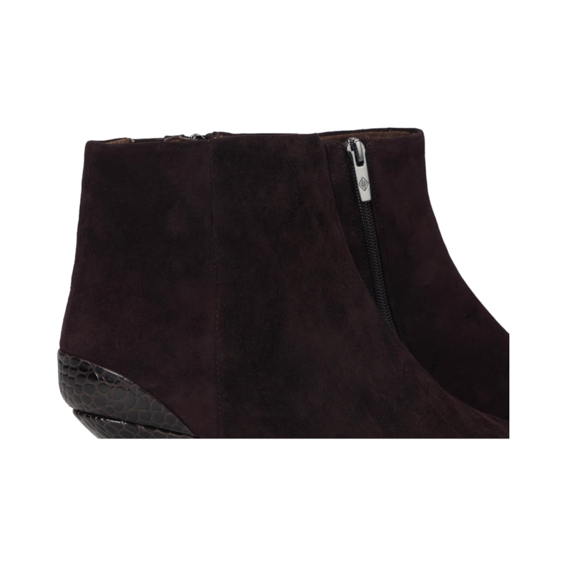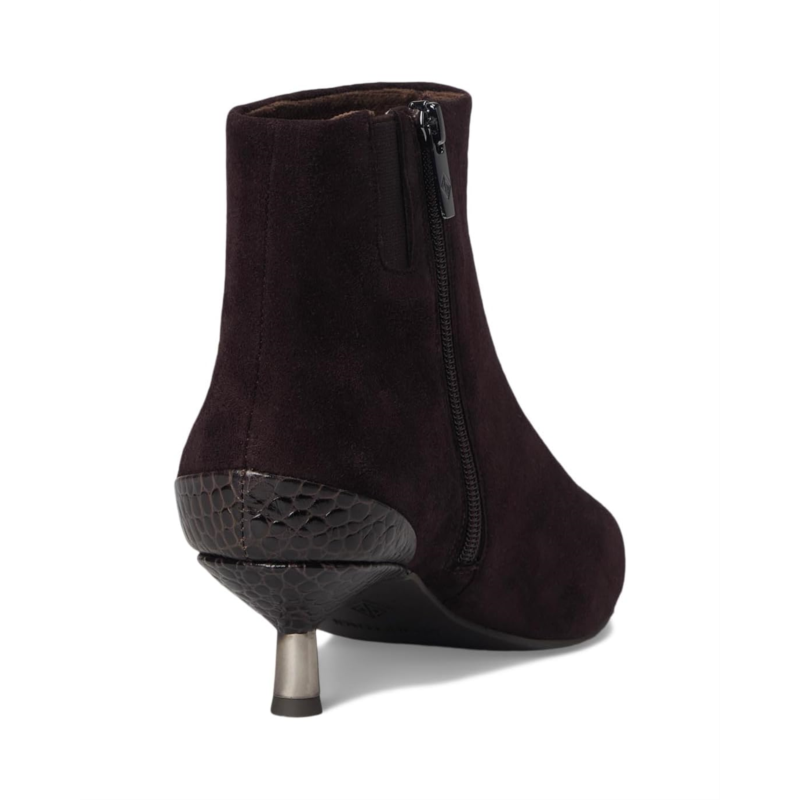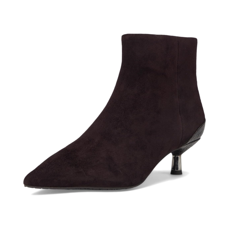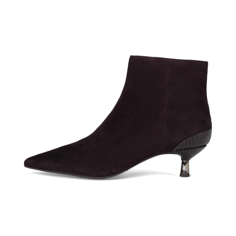 Make a statement with these Donald Pliner Dazha, sophisticated ankle boots, designed for effortless elegance and modern appeal. Featuring a sleek, suede-like upper, these boots offer a refined silhouette with a sharply pointed toe for a touch of drama. The standout detail? A uniquely sculpted kitten heel with a mix of textures and metallic accents, adding a bold yet polished finish.