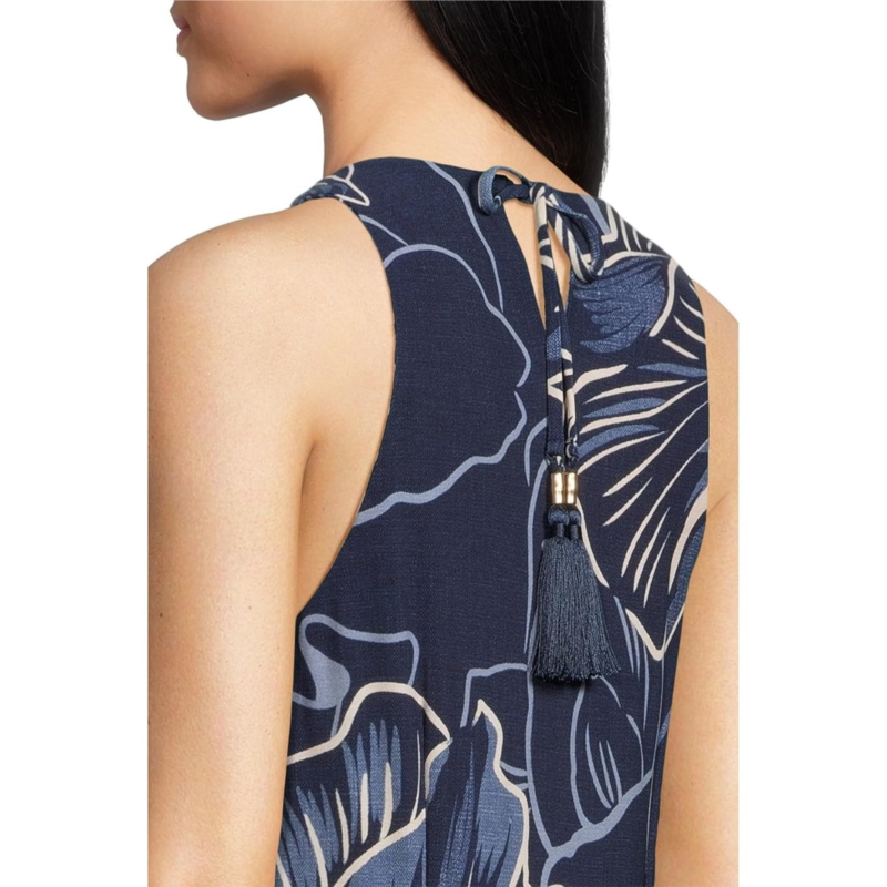 The Tommy Bahama Jasmina Sapphire Sea Maxi Dress is a breezy, elegant piece designed for sun-soaked days and effortless style. This sleeveless maxi A-line dress features a hint of stretch for comfortable movement and includes an attached shelf bra for built-in support. The neckline is adorned with self tassels accented by bamboo beads, adding a touch of tropical charm. Made from wrinkle-resistant fabric and rated UPF 30, it''s perfect for travel, beach outings, or casual gatherings where comfort meets sophistication.