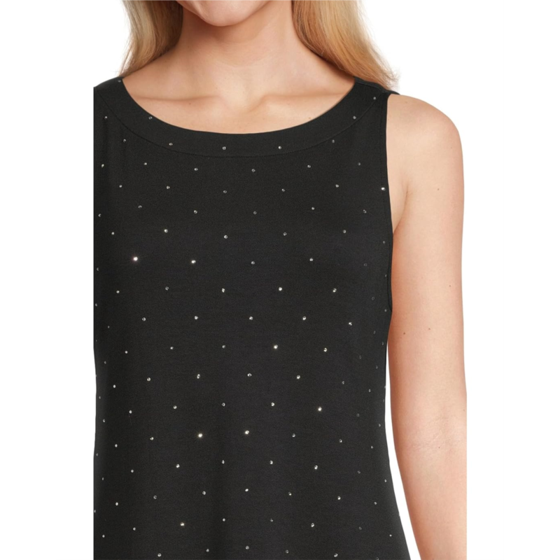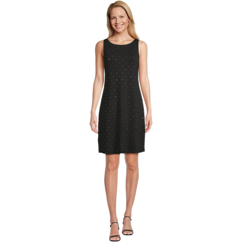 Solid sleeveless sheath dress with a hint of stretch. All-over jeweled applique details. Wrinkle resistant, UV-rated.