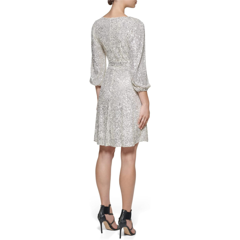 Get ready to mesmerize the crowd with your gorgeous look by wearing the DKNY Long Sleeve Sequin Surplice Faux Wrap dress.