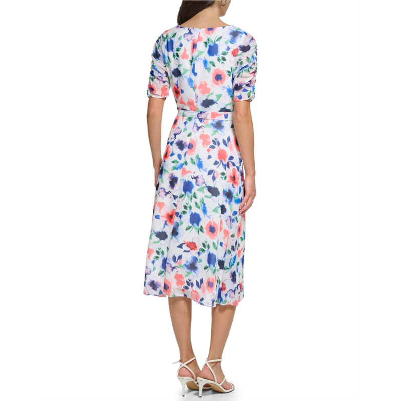Give a fresh look to your charming personality wearing the DKNY Ruched Sleeve V-Neck Faux Wrap Dress.