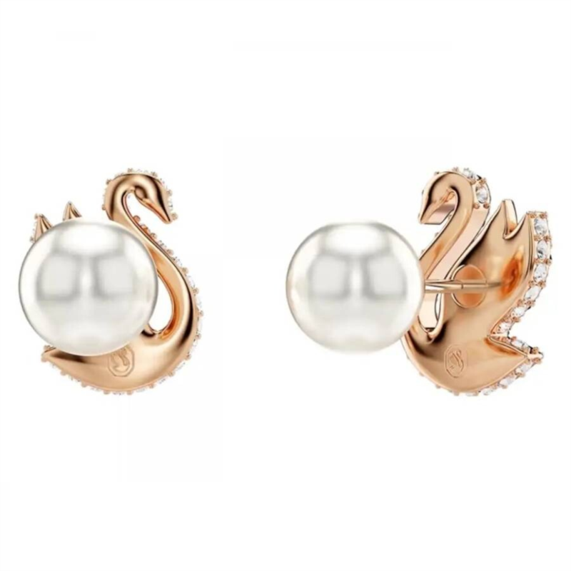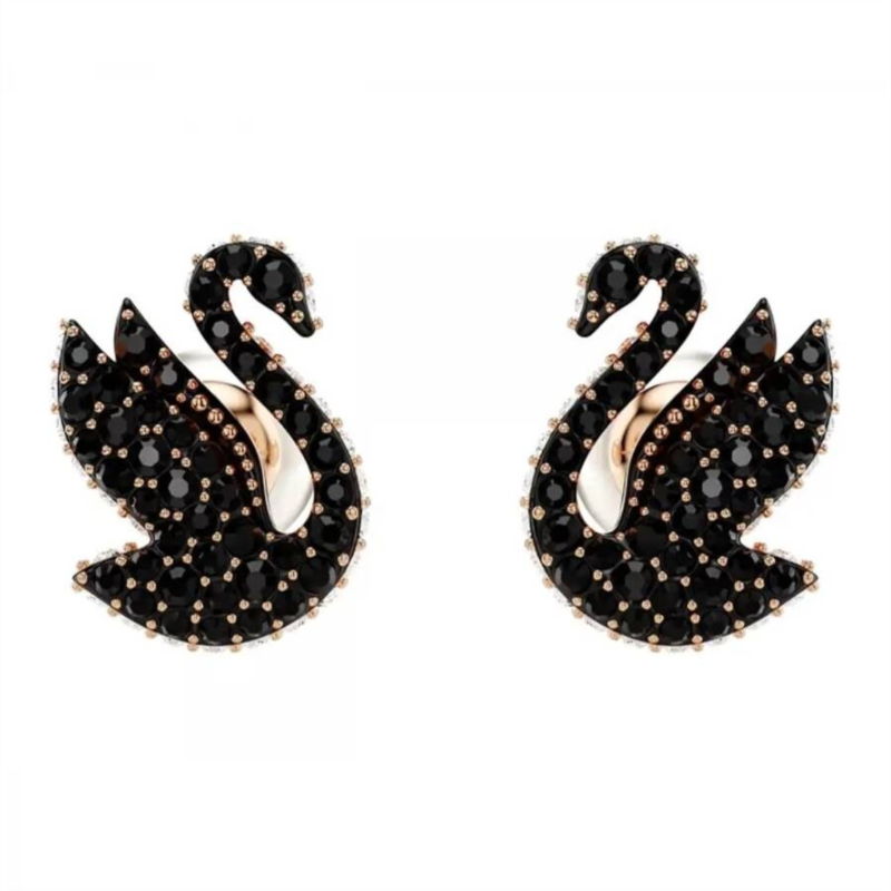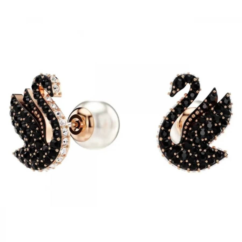 Swarovski Ladies Earrings. Swan series. SKU: 5689646. Swarovski Swan Stud Earrings. Elegant Swarovski stud earrings featuring a black swan design inspired by the iconic Swarovski swan emblem, capturing the grace of a swan preparing for flight. Crafted with black Swarovski crystals, a crystal pearl closure, and finished in rose gold-tone plating. Material: Rose gold-tone plated metal, Swarovski crystals, crystal pearl. Dimensions: Approx. 1/2'' × 3/8''.
