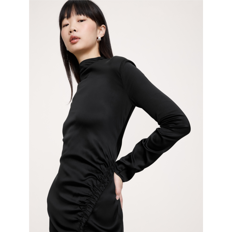 - A dress to make dressing up feel easy. We added a ruched detail to the hip of this figure-skimming maxi dress to define the shape and highlight the beautiful stretch-satin fabric.