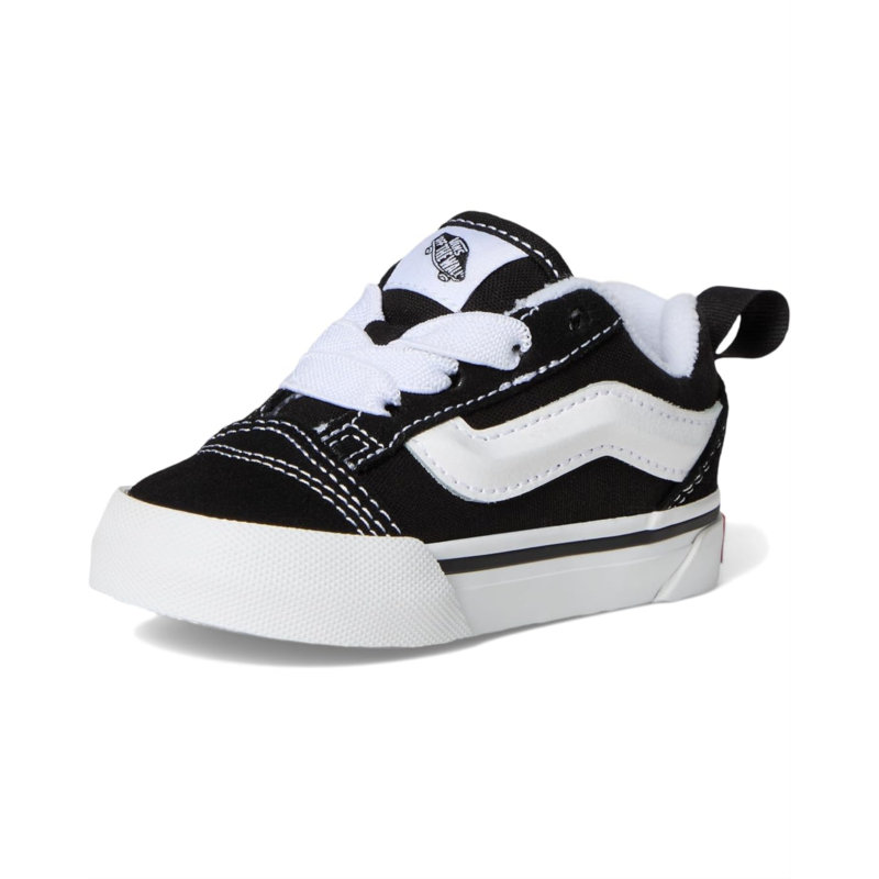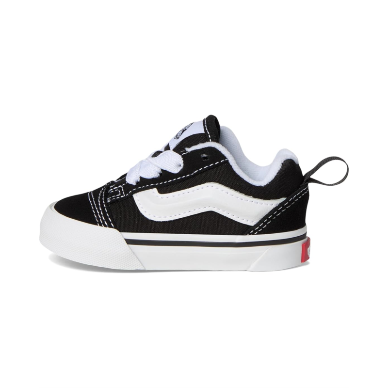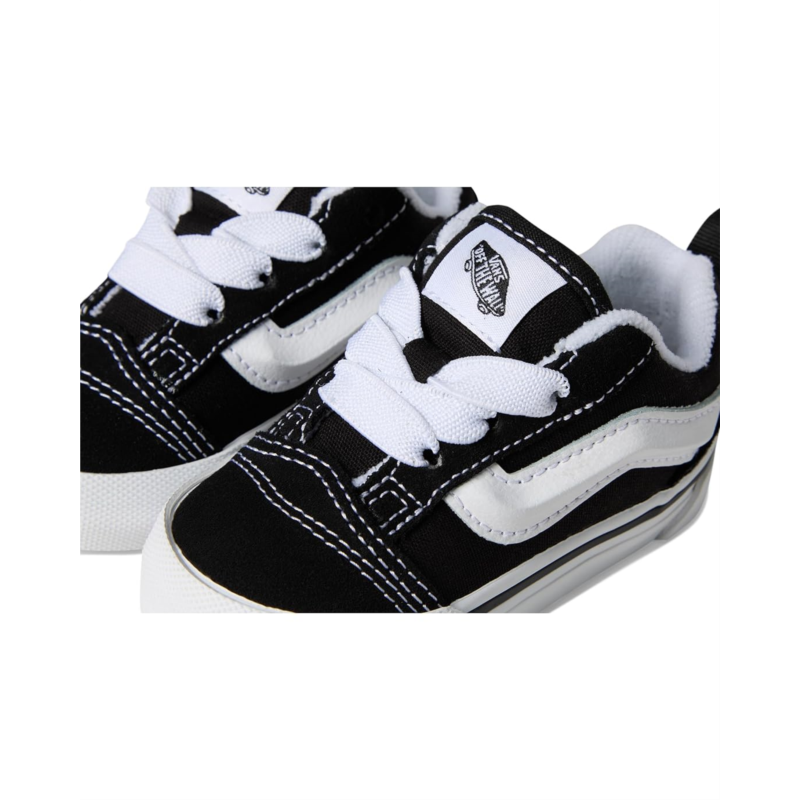 - The Vans Kids Knu Skool Elastic Lace shoes are reissued 90s low-top shoes made for toddlers. They are made of a canvas upper, a rubber insole, and a cotton lining. Their puffy tongue and ankle collar provide added comfort. These lace-up sneakers are perfect to pair with your kids different outfits and styles.