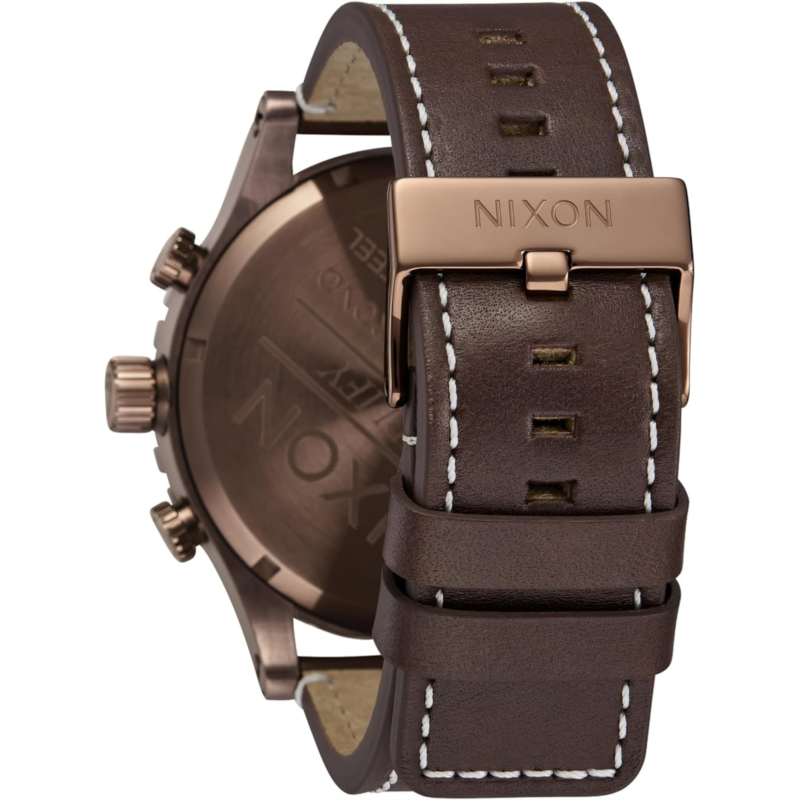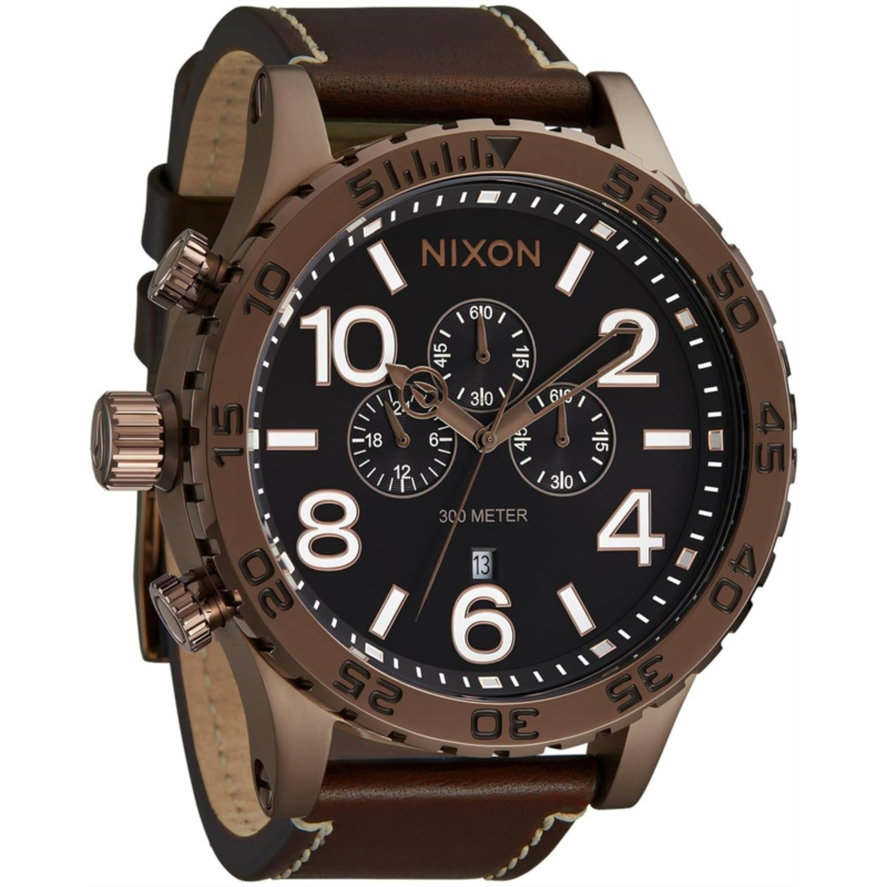 - Exude chic flamboyance wearing the Nixon 51-30 Chrono Leather Fashion Watch. The dial is surrounded by a concave dial ring and includes bold printed indices, a printed seconds track, CD textured sub-dials and custom molded hands. Crafted from 51mm, 30ATM custom solid stainless steel, the chronograph watch has unidirectional rotating bezel with countdown timer, hardened mineral crystal, screwdown crown and pushers, stainless steel screw down caseback, and screw pin lugs.