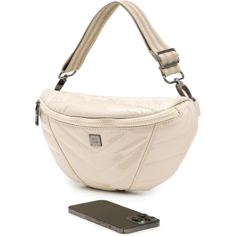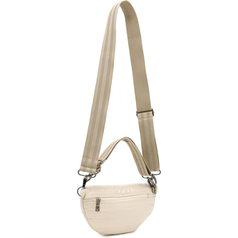 - Embrace perfection in the palms of your hands by carrying the THINK ROYLN Little Runaway?a fanny pack that adds a cool flair to your collection. The glossy exterior, adorned with the brands signature quilting, not only looks chic but also houses a spacious compartment. Secure your essentials with a zippered closure and enjoy versatility with two adjustable, detachable straps. Additionally, discover convenience with a discreet zippered interior pocket on the back.