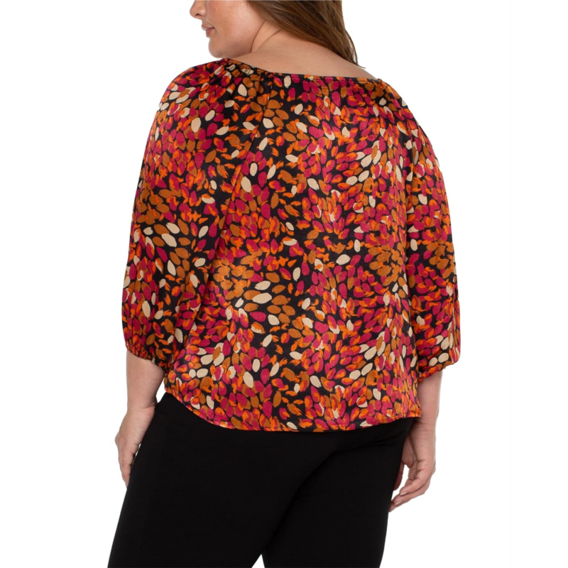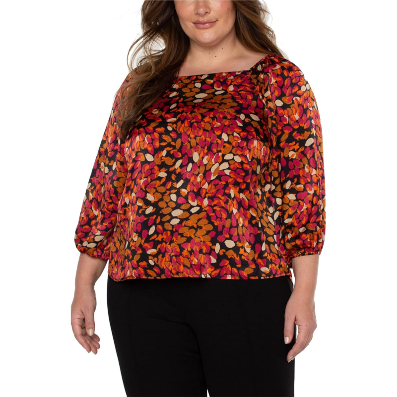 Experience the perfect blend of warmth and style with this versatile and fashion-forward Liverpool Plus Size Puff Sleeve Square Neck Woven Top with Liverpool exclusive print. Autumn colors and feminine details make this top a must-have for your wardrobe.
