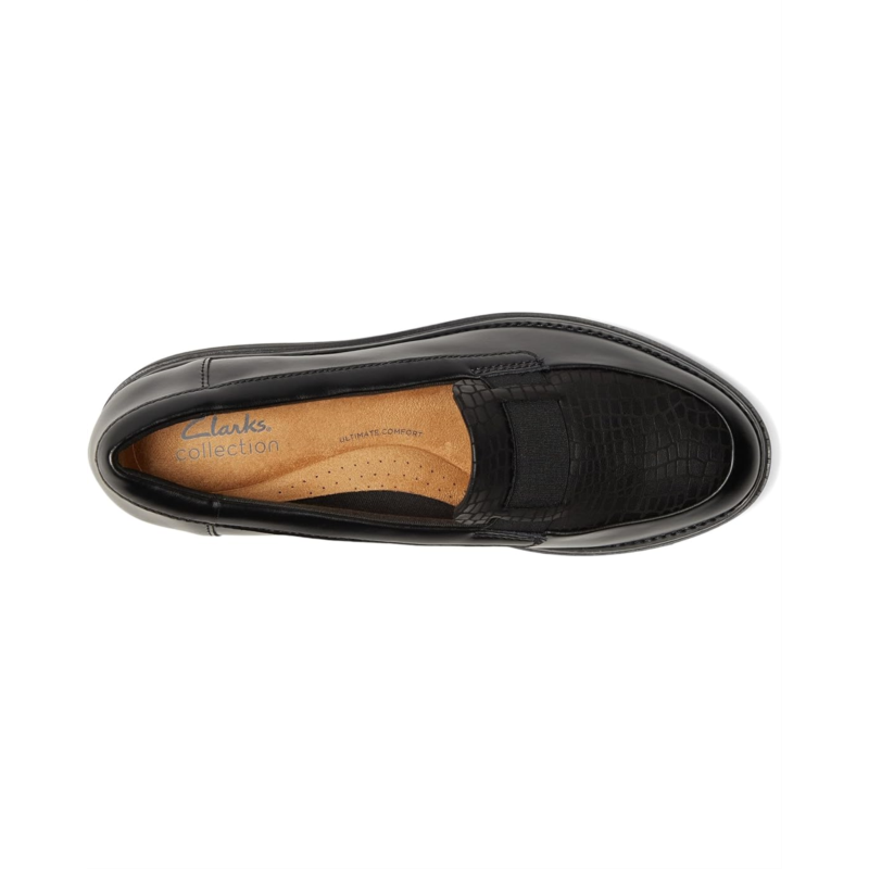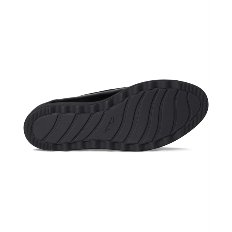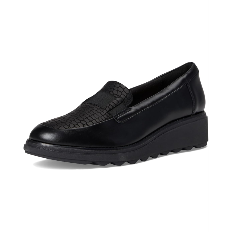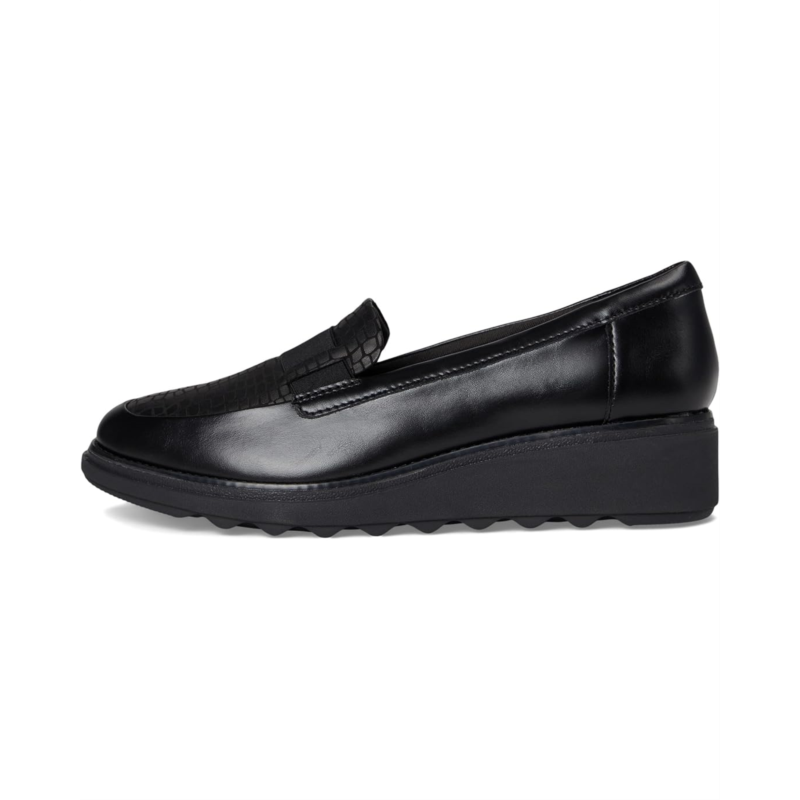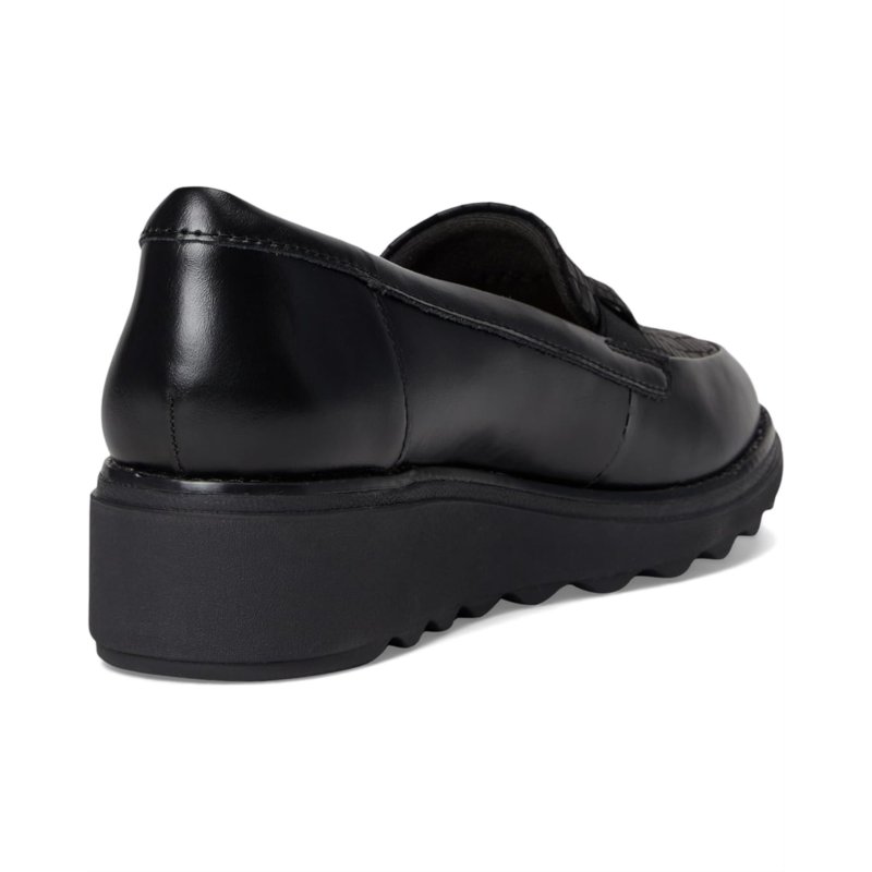 The Clarks Sharon Pace takes the classic loafer to new heights, offering a perfect fusion of modern style and everyday ease. Crafted with a premium black leather upper, this slip-on design is polished yet practical, making it the perfect companion for busy days and stylish nights. The trend-led wedge heel adds just the right amount of lift, while the high-traction cleated EVA outsole ensures stability with every stride. Inside, your feet are cradled by an Ortholite Hybrid footbed and Cushion Soft foam layers, delivering dual-density support, breathability, and shock absorption that keeps you going in total comfort. A rubber insole enhances flexibility and durability, making this loafer a long-lasting wardrobe staple.
