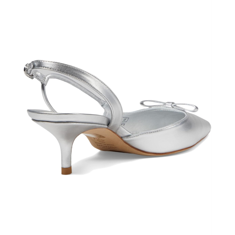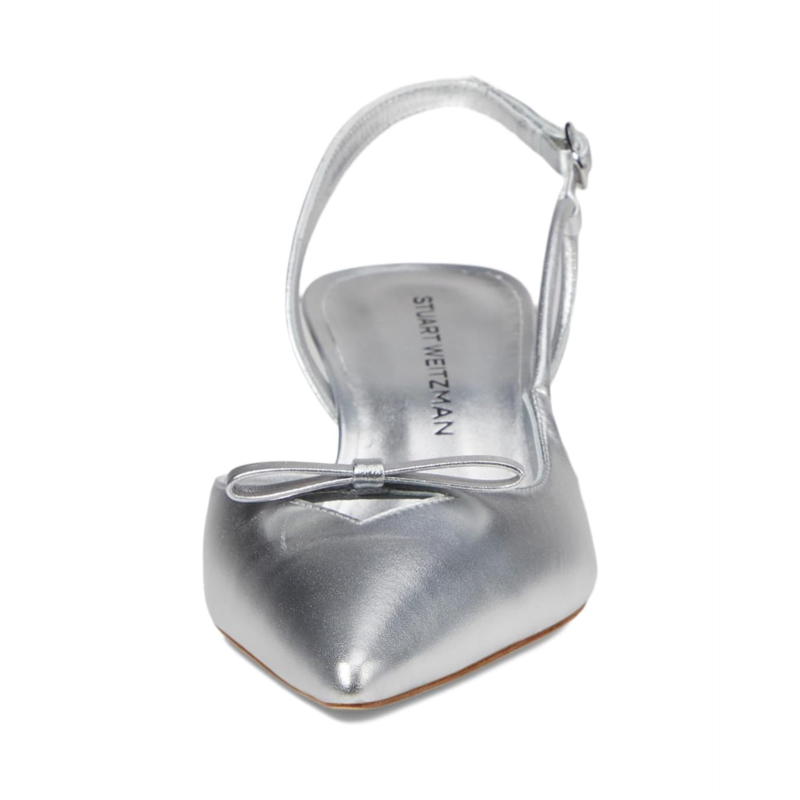 Step into timeless elegance with the Stuart Weitzman Tully 50 Slingback, a refined and versatile shoe that epitomizes sophistication. Featuring a sleek kitten heel and sharp pointed toe, this slingback exudes chic charm. The standout detail is the delicate bow adorning the toe, adding a touch of femininity and charm to the design. The slingback strap with an adjustable buckle closure ensures a secure and personalized fit.