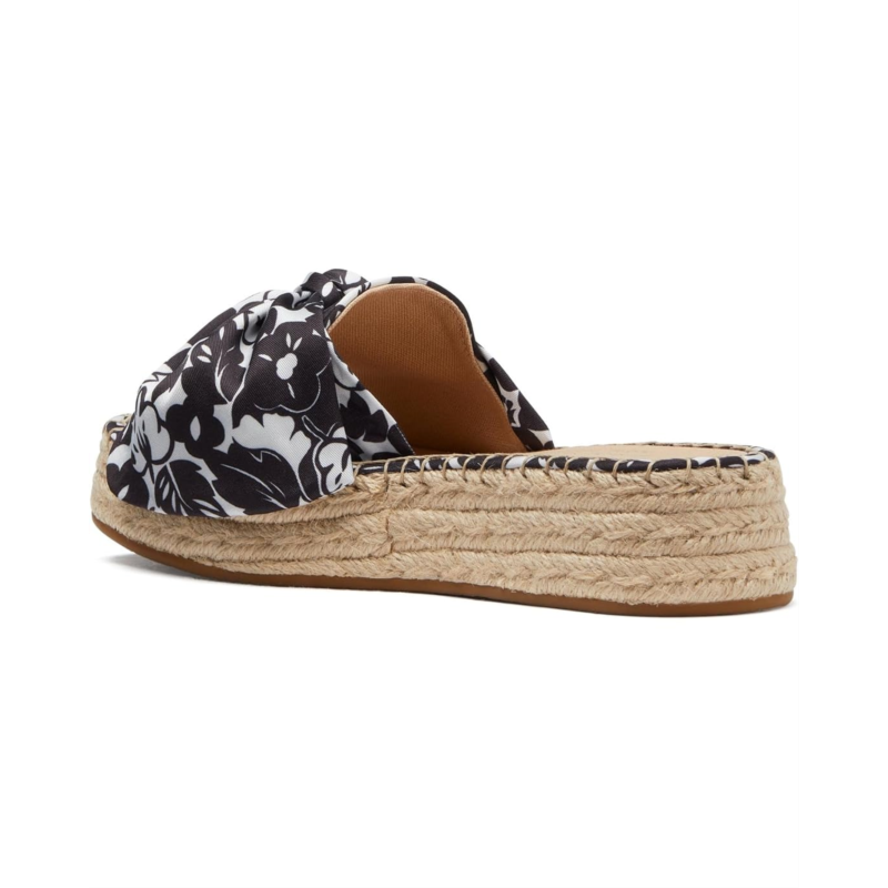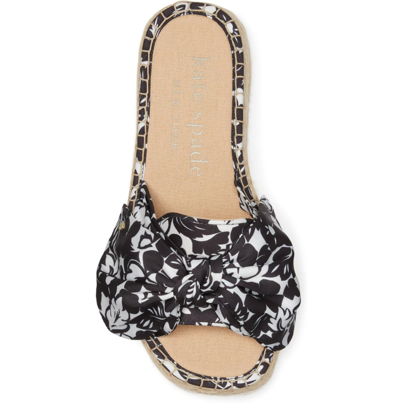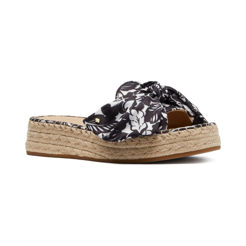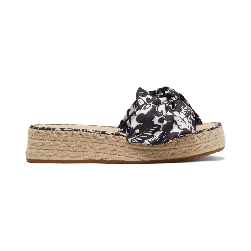 Floral printed bow with a knot brings a charming touch to the structure of Kate Spade New York Lucie Tropical Foliage Espadrille Sandals. The slip-on footwear features jute upper construction with flatform espadrille design and open square toe silhouette.