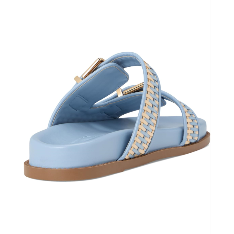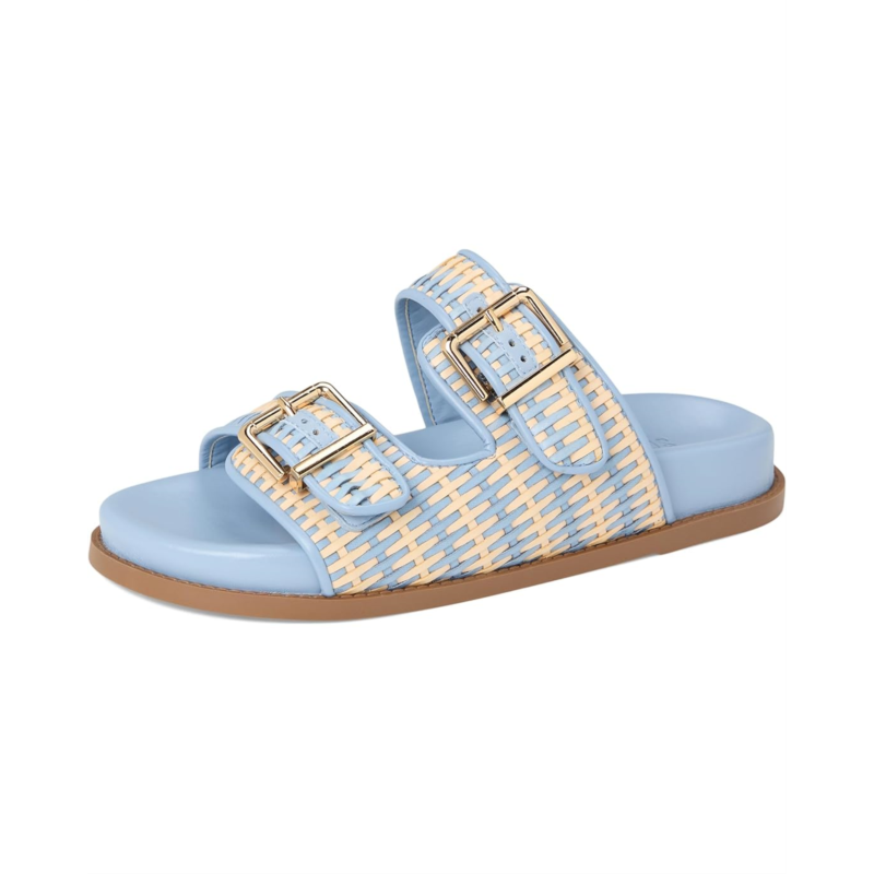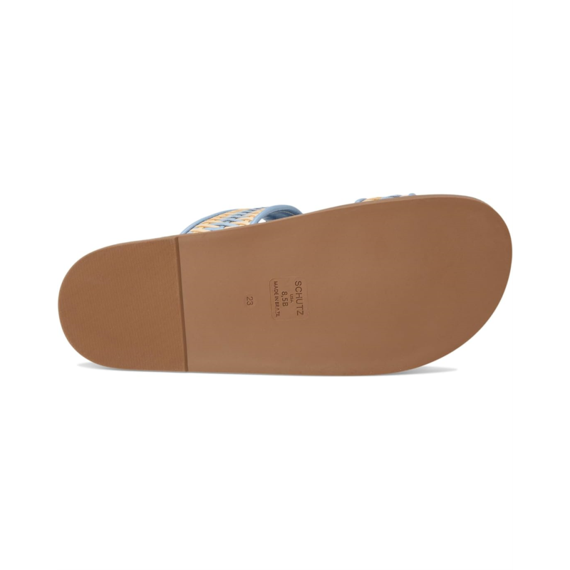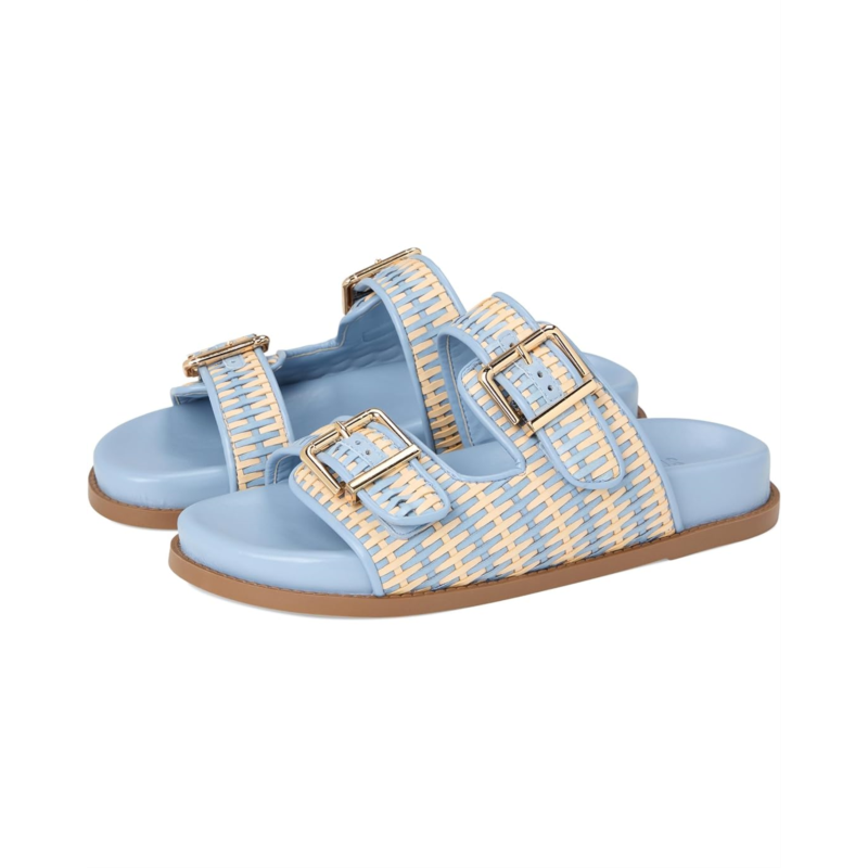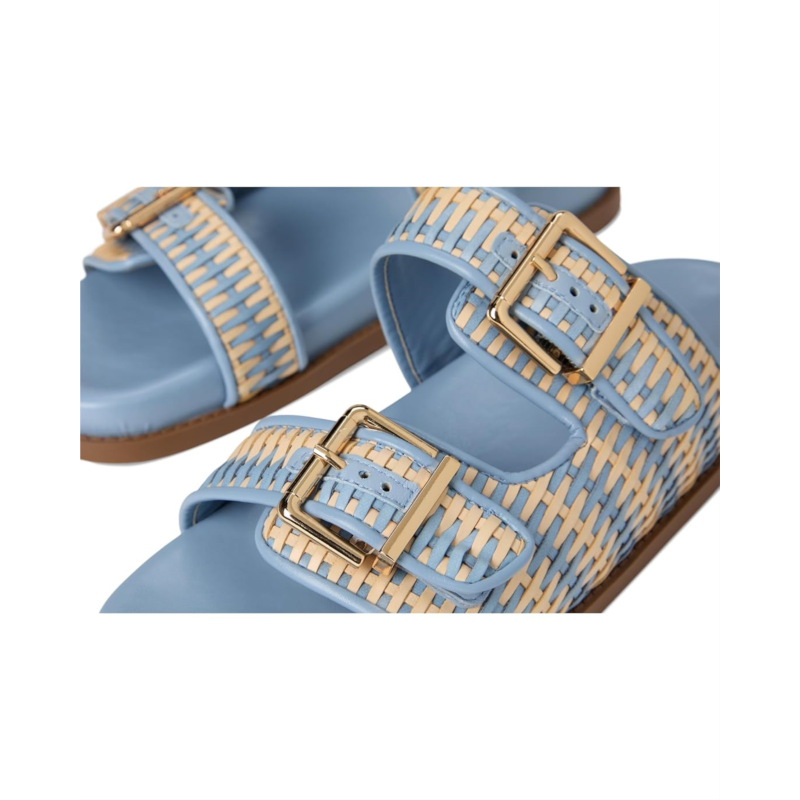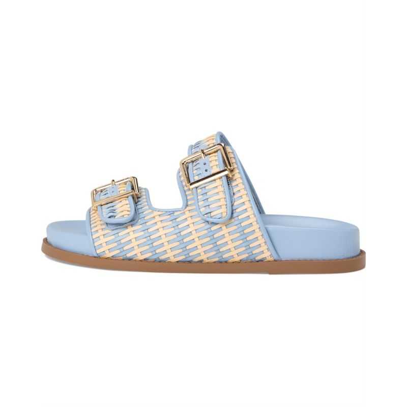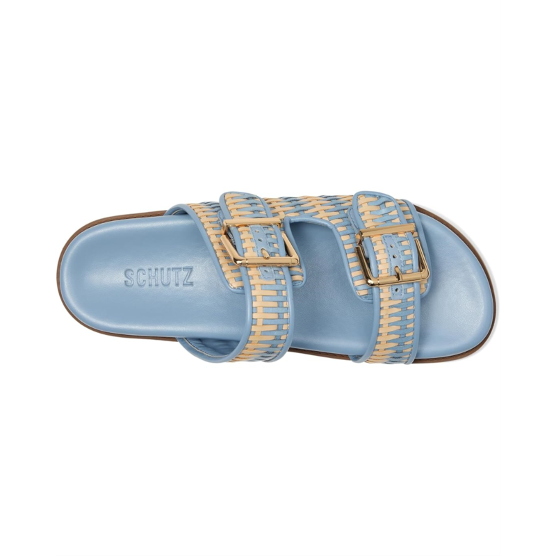Large buckle adorns the sleek raffia straps resting over the Schutz Naomi sandal. This slip-on footwear features a padded footbed and round toe silhouette.