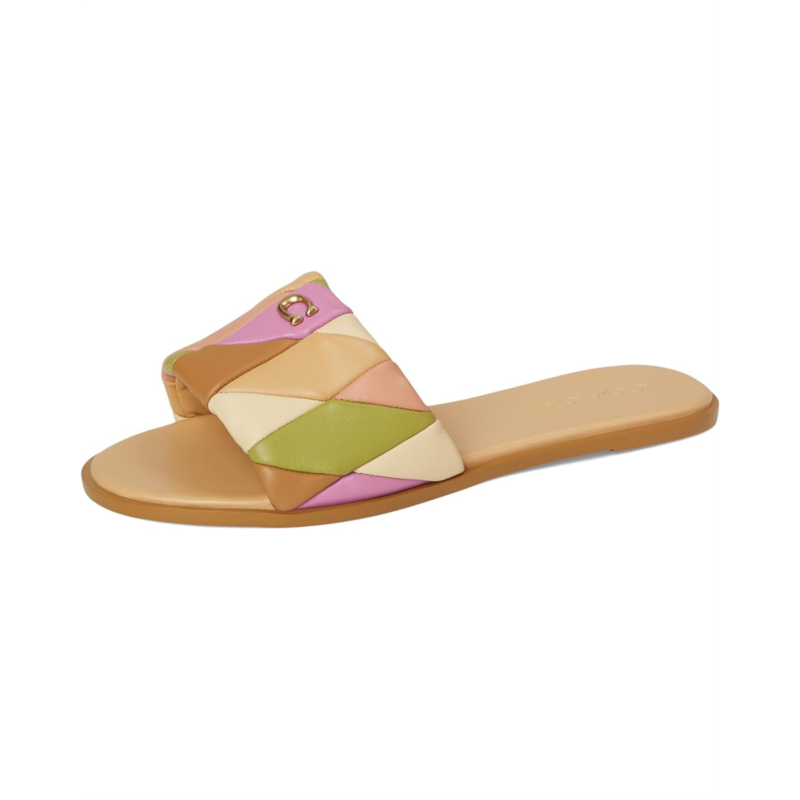 Slide into your day with these versatile COACH Holly Quilted Patchwork Leather Sandals - lightweight, durable, and made to match any outfit. Crafted from leather upper, man-made leather lining and footbed, this pair of slip-on sandals features open round toe, low-top silhouette, and brand logo on the vamp.