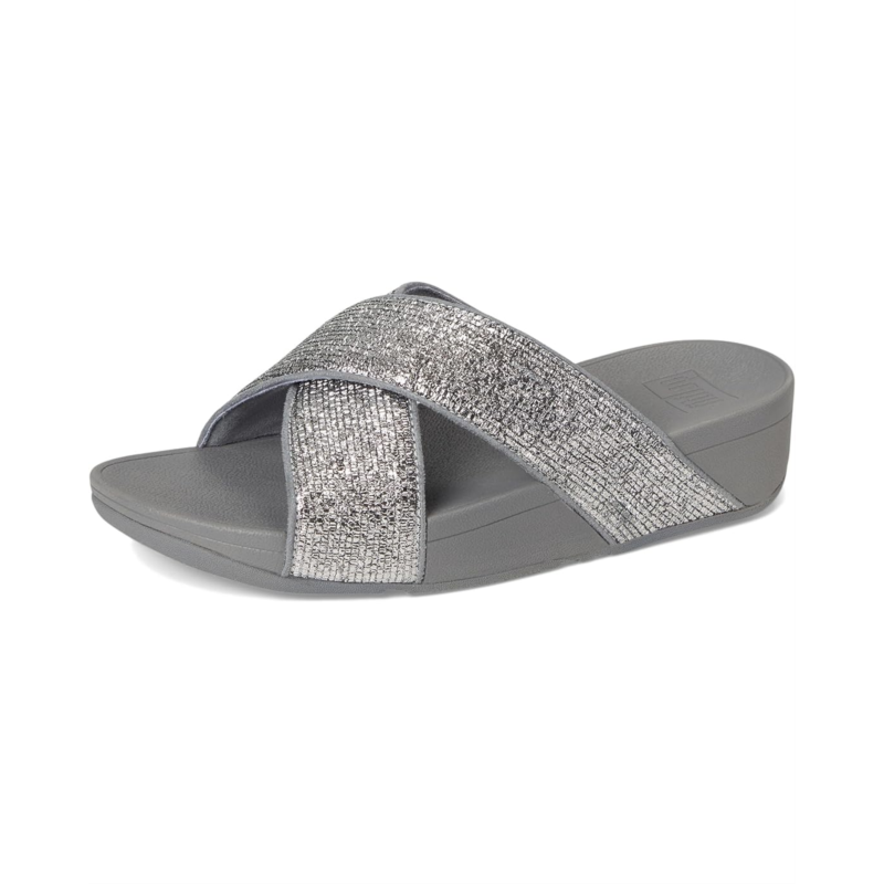 The FitFlop Lulu Crinkled-shimmer Cross Slides are the classics. Perennially popular, they''re softly padded, foot-flattering, and on FitFlop''s Microwobbleboard midsoles for unbeatable all-day comfort. This season, crafted in a glittering crinkled-foil polyurethane upper, these slides are an irresistible mix of shimmer and texture. They are styled with tonal piping. Their rubber insole and polyester lining offer added comfort. These slide sandals are ergonomically engineered to help optimize your body''s alignment, natural movement, & energy. APMA-accepted, they offer natural arch support and are grip-suited to everyday use/road tread. Simple but glitzy, these slip-on sandals are equally good whether you''re doing daytime glamour or headed to a party.