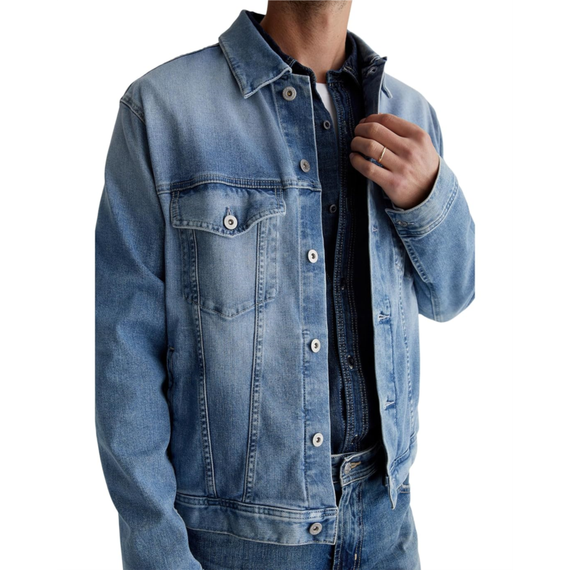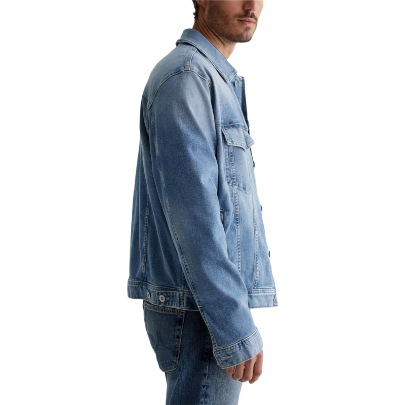The AG Jeans Dart Classic Trucker jacket is a classic men''s trucker in a faded medium indigo wash. It''s cut from a comfortable 9.4 oz. Hypersoft indigo denim, an exclusive AG Cloud Soft Denim fabric. This denim jacket features a buttoned front closure for easy wear and is styled with long sleeves, buttoned cuffs, a collared neckline, and a straight hem. It''s got a special left-hand twill construction that allows the yarns to gently relax and untwist for a supple feel that gets softer with every wear.