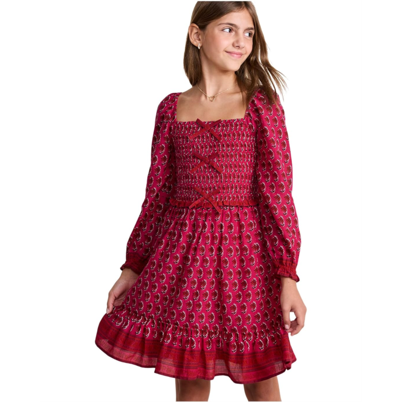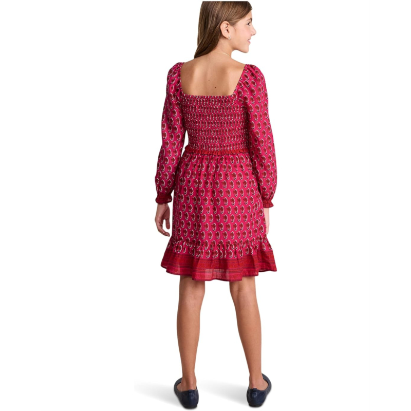 The vineyard vines Kids Lena Smocked Dress is the picture of carefree charm and effortless style. Designed with a classic square neckline and a smocked bodice adorned with a dainty bow, it brings timeless sweetness to her everyday adventures. The long puffed sleeves with elasticized cuffs add a touch of whimsy, while the ruffle hem detail gives every twirl a graceful finish. Falling above the knee and crafted in a pull-on silhouette, it''s perfect for easy dressing and all-day comfort. With its cute smocked details and swingy ruffled skirt, this dress makes every moment feel a little more magical, ideal for playdates, parties, and picture-perfect days.