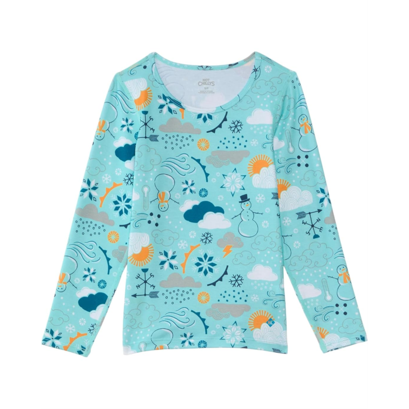 The Hot Chillys Kids Originals Print Crew Neck is a long-time favorite with a cotton-like hand feel that does not hold moisture. Made with our Moisture Transfer Fibers it moves moisture away from the skin to be evaporated so you stay warm & dry. The 4-way stretch fabric and body fit design allows a next-to-skin performance fit and the sublimated prints retain vibrant color & fabric properties. The pull-on style tee features a crew neckline, long sleeves, allover printed details, and a straight hem that completes the look.