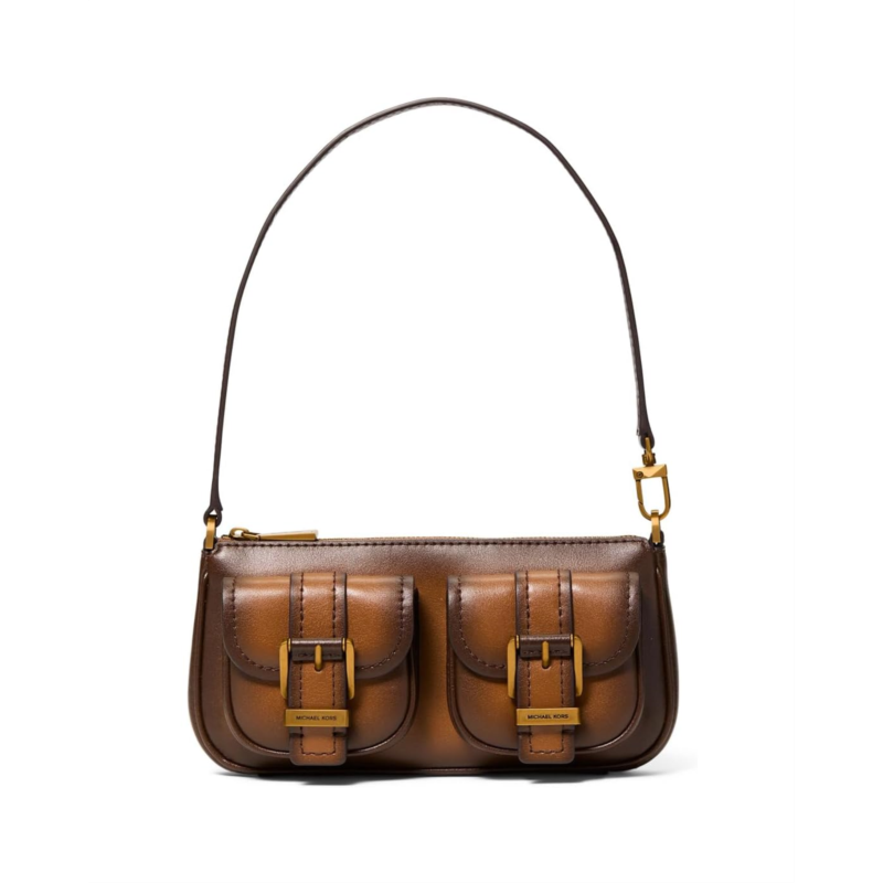 Designed for the essentials, the MICHAEL Michael Kors Zoe Small Convertible Pouchette, looks aesthetic. Crafted from leather, this handbag features zippered closure, one shoulder strap, one interior slip pocket, two exterior slip pockets with buckle detailing and flap closure.