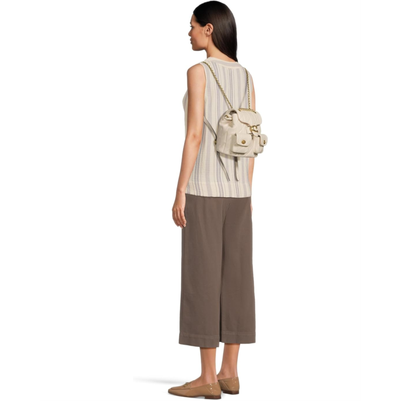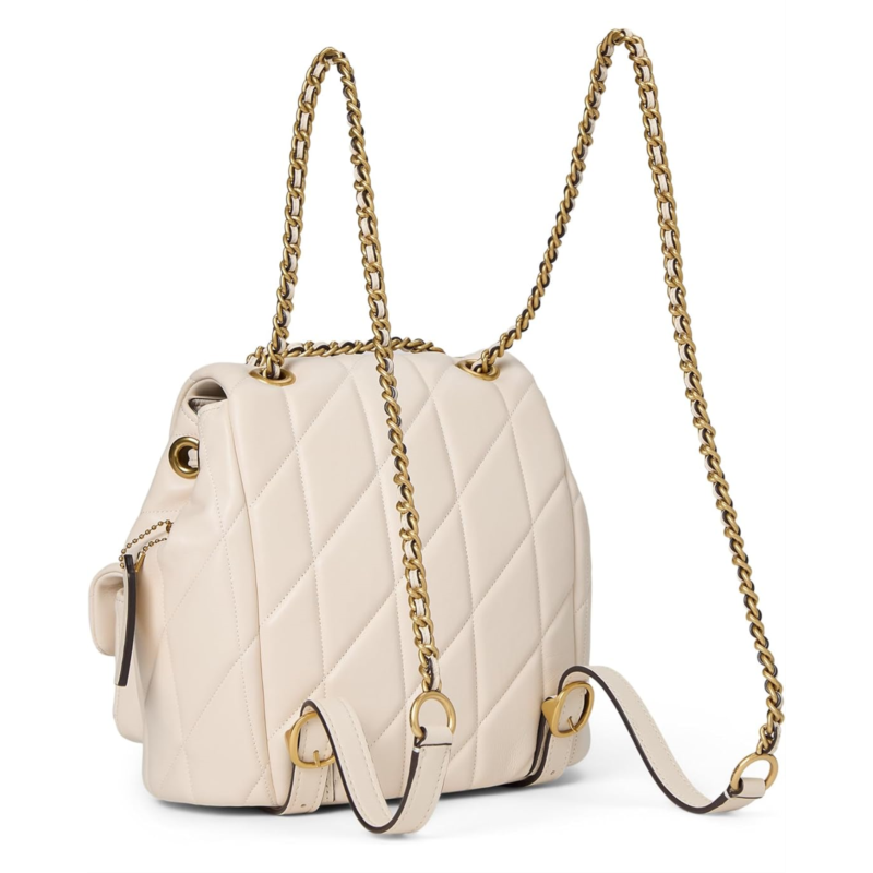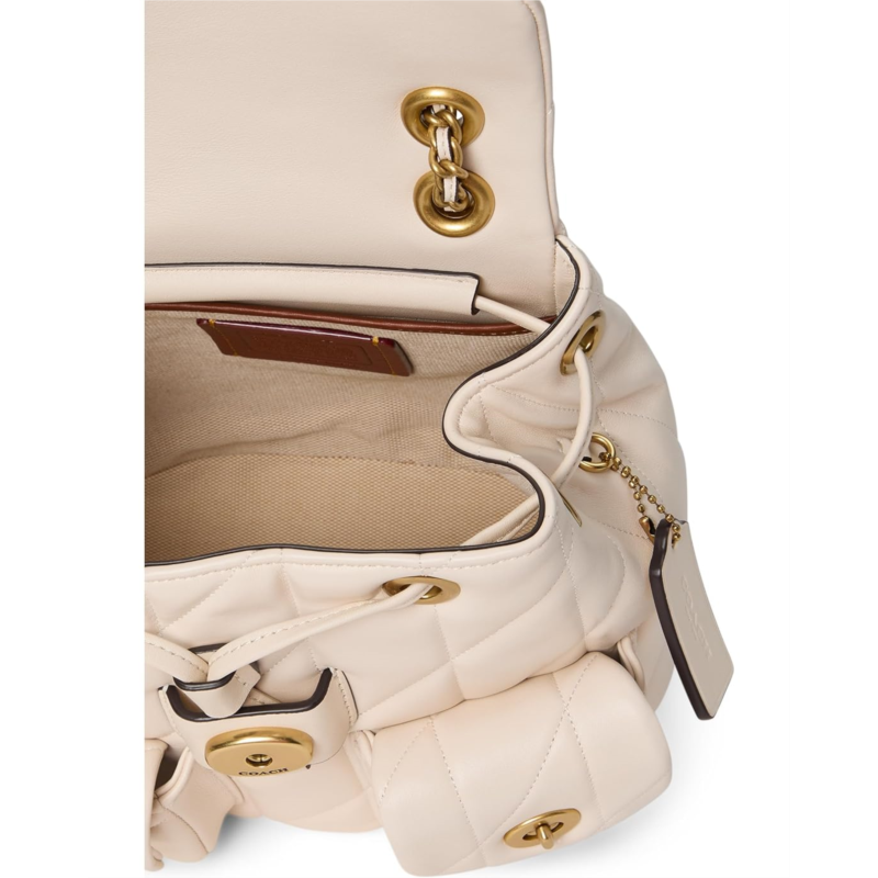 Meet the COACH Tabby Backpack with Quilting, your all-time companion for outdoor ventures. Featuring allover quilting construction, this backpack is designed with an interior slip pocket for easy organization. The drawstring and snap closures ensure your belongings are secure. The chain strap with 19 drop offers a fashionable look, complemented by outside turnlock pockets for additional storage. Adjustable shoulder straps provide a comfortable fit, making this backpack both versatile and trendy.