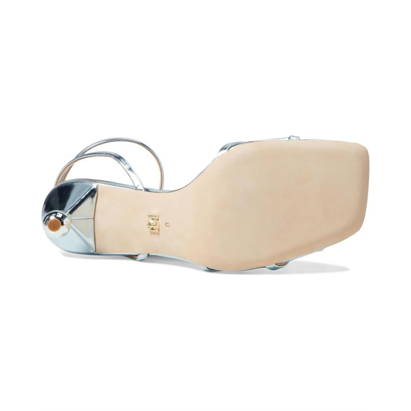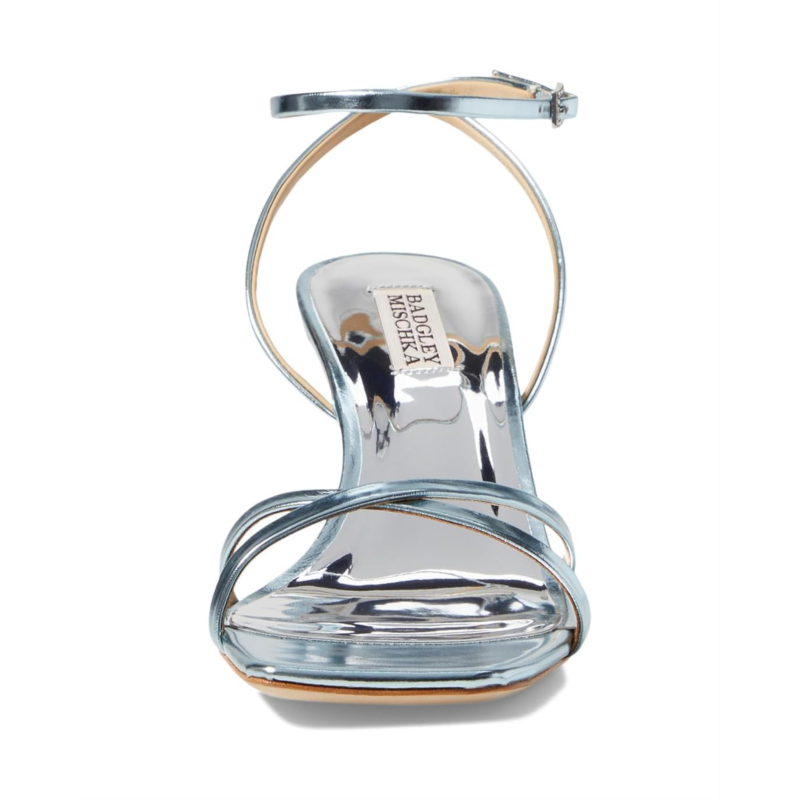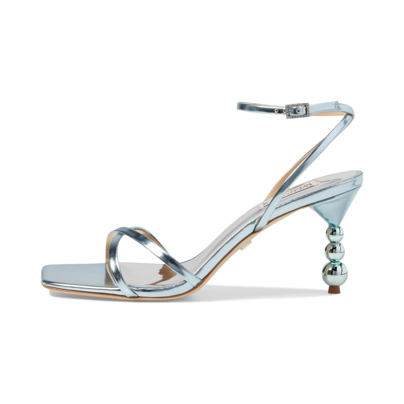 Step into elegance with Badgley Mischka Callie sandals. Featuring crisscross straps on the upper and an open square toe, they exude sophistication with a modern twist. The stiletto heel is adorned with metallic pearl detailing, adding a touch of glamor to any ensemble.