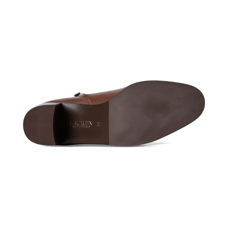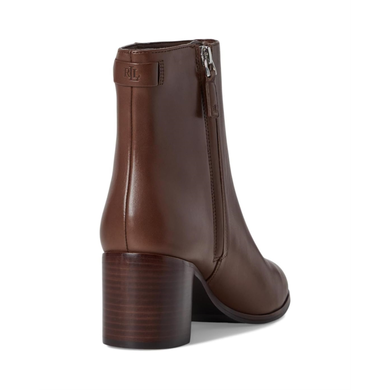 Flaunt your stylish look wearing the sleek silhouette Lauren Ralph Lauren Cassie Burnished Leather Bootie in luxuriously smooth burnished leather for a refined sensibility. A stacked leather heel creates a leg-elongating effect, while an LRL-debossed logo at the back of the ankle adds a signature finishing touch. Featuring almond toe, block heel, zippered side closure, and padded insole.