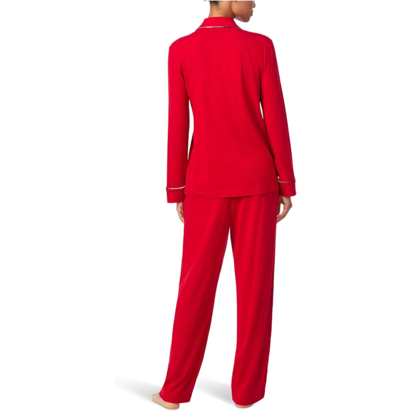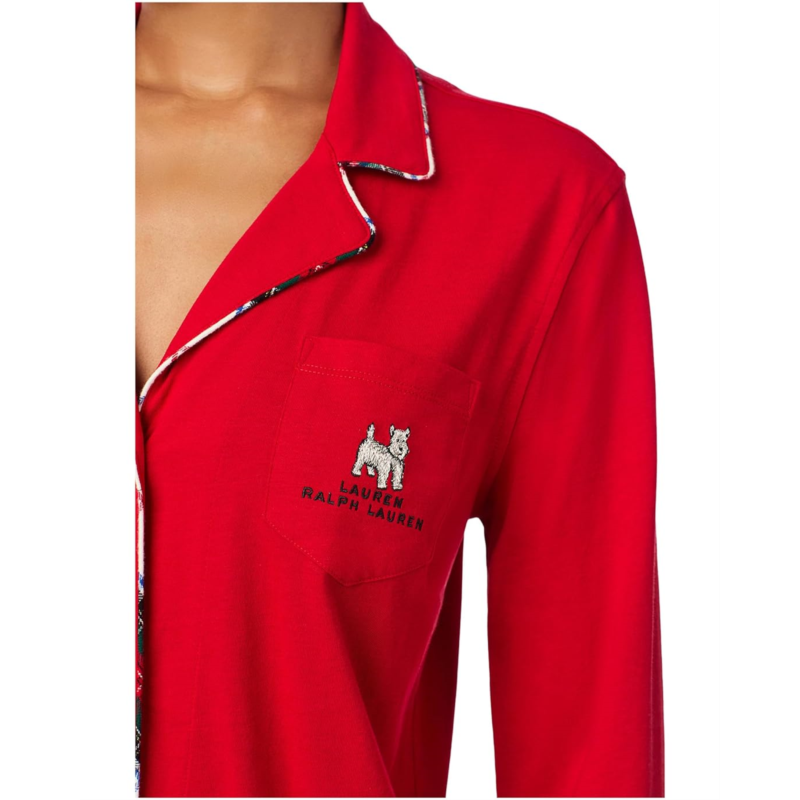 The Lauren Ralph Lauren Long Sleeve Notch Collar Knit PJ Set blends classic tailoring with cozy ease, making every night feel like a retreat. Designed with a chic notch lapel collar, elegant long sleeves, and a button-front closure, this set captures that effortless lounge-to-bed sophistication. A smart chest pocket adds a hint of polish, while the pull-on pajama bottoms keep things simple and relaxed for all-night comfort. Crafted in a soft knit fabric, it drapes beautifully and feels incredibly gentle against your skin, inviting you to unwind in luxury.