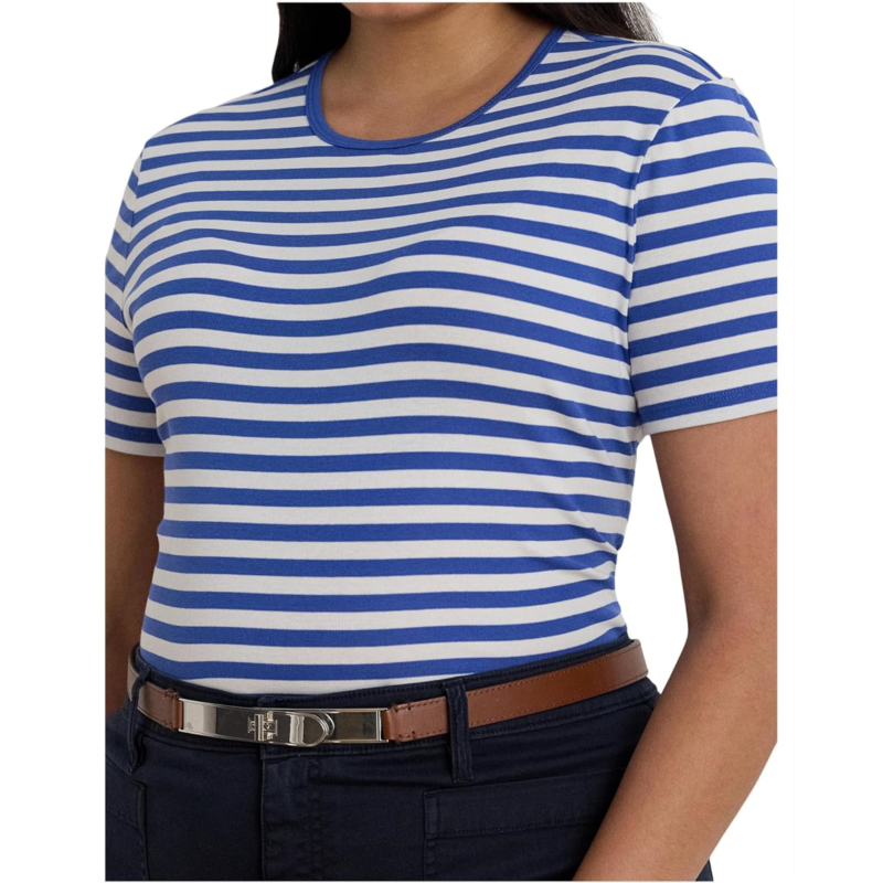 Style your look in the classy and comfortable Lauren Ralph Lauren Plus Size Striped Stretch Cotton Crewneck Tee featuring a ribbed neckline and short sleeves. The slim-fitted tee features allover stripe pattern with brand embroidered logo at the front right hem.