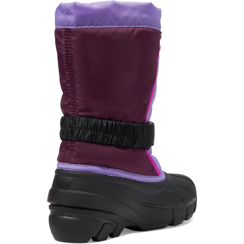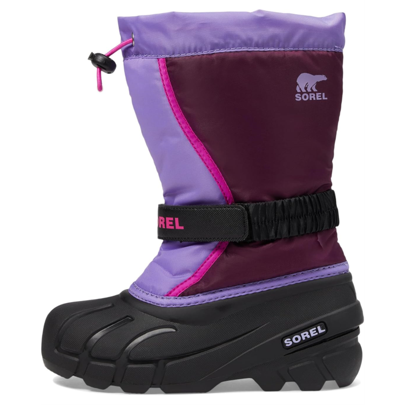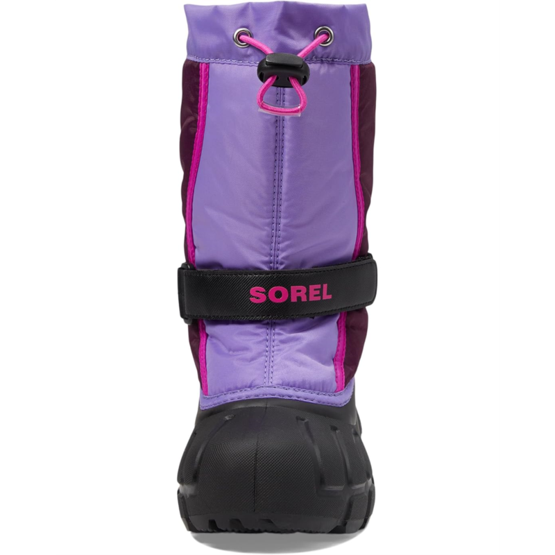 Snowy adventures made easy: Conquer cold styling SOREL Kids Flurry boots, where style meets function. These high-performance boots are crafted with a durable water and wind-resistant polyurethane-backed synthetic textile upper, ensuring they keep wet conditions at bay. The built-in gaiter and barrel lock closure system, paired with a fixed elastic instep strap, provide a snug fit to keep the snow out. The removable, washable recycled felt inner boot offers unmatched warmth, while the injection-molded waterproof thermal rubber shell, combined with a multi-directional lug outsole, delivers superior traction and stability on slick surfaces. Easy on, easy off - these boots are perfect for every snowy adventure!