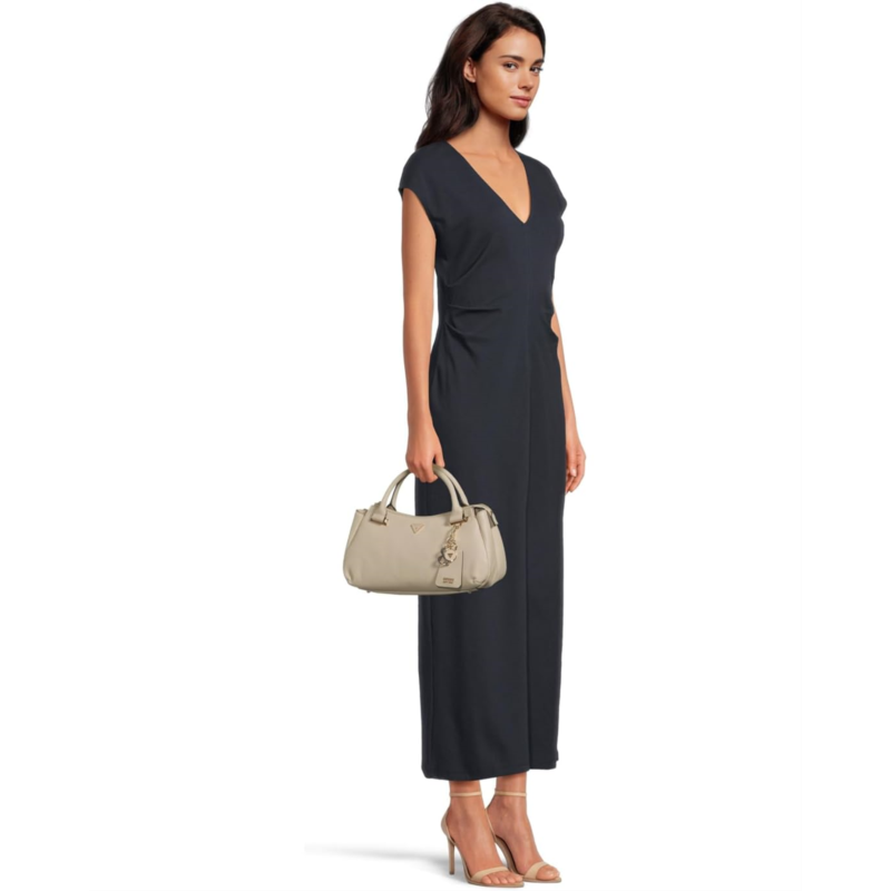 Style your looks by pairing them with the GUESS Evie Triple Compartment Satchel Bag. The triple compartment satchel bag comes in an eco pebble PU construction with a zippered closure for added security. The two top grab handles and detachable crossbody strap allow easy and versatile carrying options. The shiny gold hardware looks exquisite and adds an authentic touch.