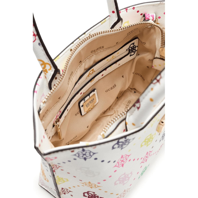 - The hallmark of effortless cool, GUESS Emelie Logo Mini Tote. Crafted from sleek PU material with a smooth polyester lining, this compact tote delivers a luxe look without the fuss. The eco 4G peony logo print adds that instantly recognizable GUESS appeal, while shiny gold hardware elevates the design with a polished finish. Designed with one main compartment and an interior zipper pocket, it keeps your essentials neatly organized and easy to reach. The secure zipper closure ensures everything stays in place, whether youre brunch-hopping or heading out for errands. Carry it your way with the structured top handle for a classic tote moment, or switch things up using the detachable crossbody strap for hands-free styling on the go.