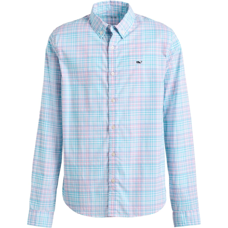 • The featherweight powerhouse, vineyard vines Plaid Featherweight Performance Shirt. Designed for boys who never slow down, this super-lightweight shirt delivers easy polish without the bulk. The crisp collared neck and clean button-front closure keep the look sharp, while long sleeves with buttoned cuffs offer a classic finish that works for school days, family outings, and everything in between. What really sets it apart? Performance that keeps up. Crafted with moisture-wicking, quick-drying fabric, this shirt helps him stay cool, dry, and comfortable from morning to night. Built-in stretch allows freedom of movement, so running, climbing, and exploring feel effortless.