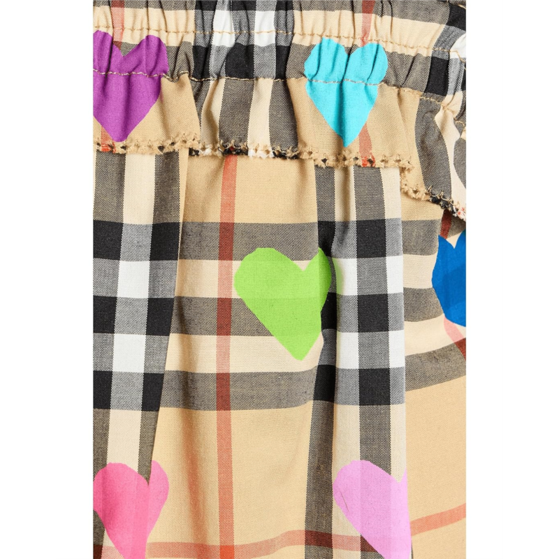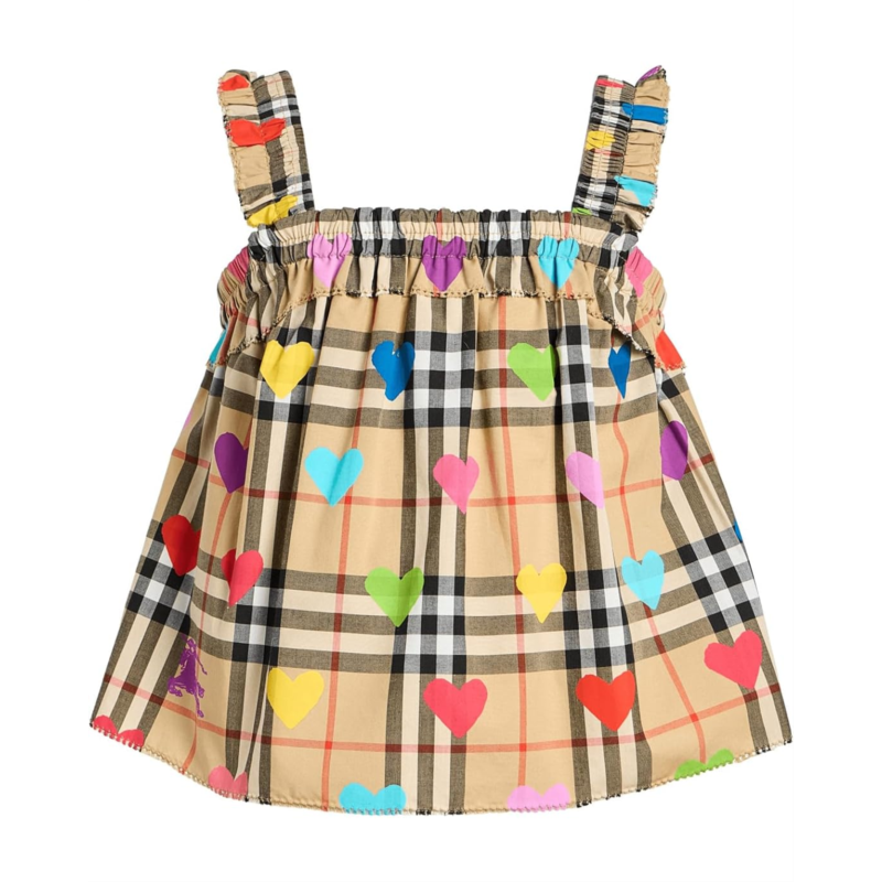 - Give a touch of charm to your little star with the Burberry Kids Gabi Heart Check Shirt. Designed for your little one, this piece boasts a classic A-line silhouette with wide straps and gentle gathering at the neckline, creating a liberating sense of movement perfect for summer leisure. Fashioned from sumptuous, lightweight cotton, the top pairs an iconic tartan pattern with an exuberant overlay of multicolored hearts. This delightful fusion elevates the garment, channeling both timeless luxury and the effervescent joy of childhood.