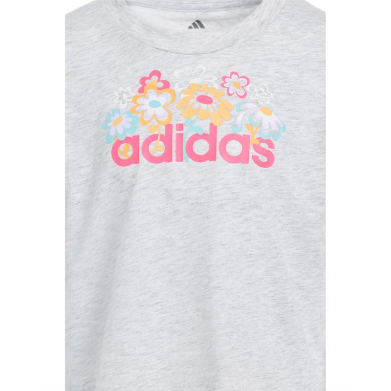 - Let your little one shine bright in the adidas Kids Heather Tee & Flowy Short Set, a feel-good outfit made for everyday adventures. This charming two-piece set features a short sleeve tee with a cheerful floral bouquet print that adds a playful pop to their look. Designed with a classic crew neck, short sleeves, and a regular fit, the tee feels easy and breathable for all-day comfort. The matching flowy shorts are just as fun and functional, featuring a flat front, mid-rise waist, and a pull-on design for effortless dressing. A high-low hem layered over internal bike shorts offers extra coverage and confidence during active play. Crafted from soft jersey fabric, this set keeps kids comfy, while the encased elastic waistband ensures a secure yet flexible fit. Finished with subtle 3 Bar Logos, it blends sporty style with everyday charm.